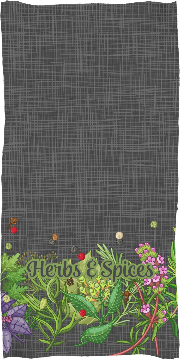 The design features an adorable frame of illustrated peppers, garlic, ginger, and other herbs. The background is a subtle texture in a charcoal color. A fun ribbon made with other spices and herbs makes the coordinating design. Both are easily personalized.
