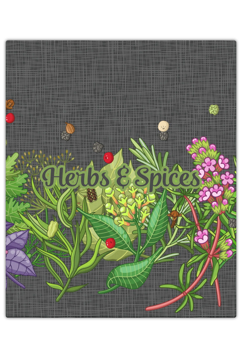 The design features an adorable frame of illustrated peppers, garlic, ginger, and other herbs. The background is a subtle texture in a charcoal color. A fun ribbon made with other spices and herbs makes the coordinating design. Both are easily personalized.