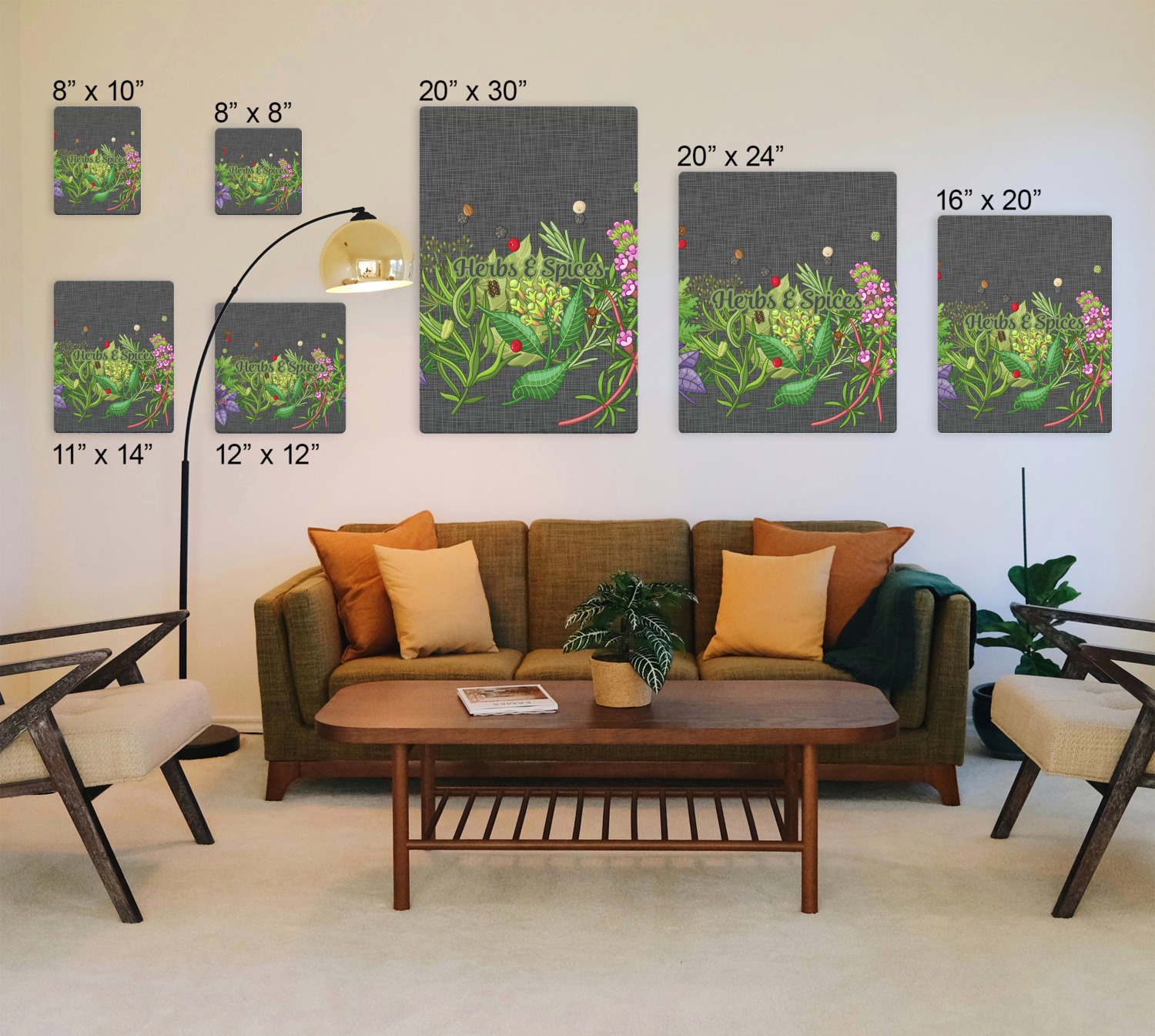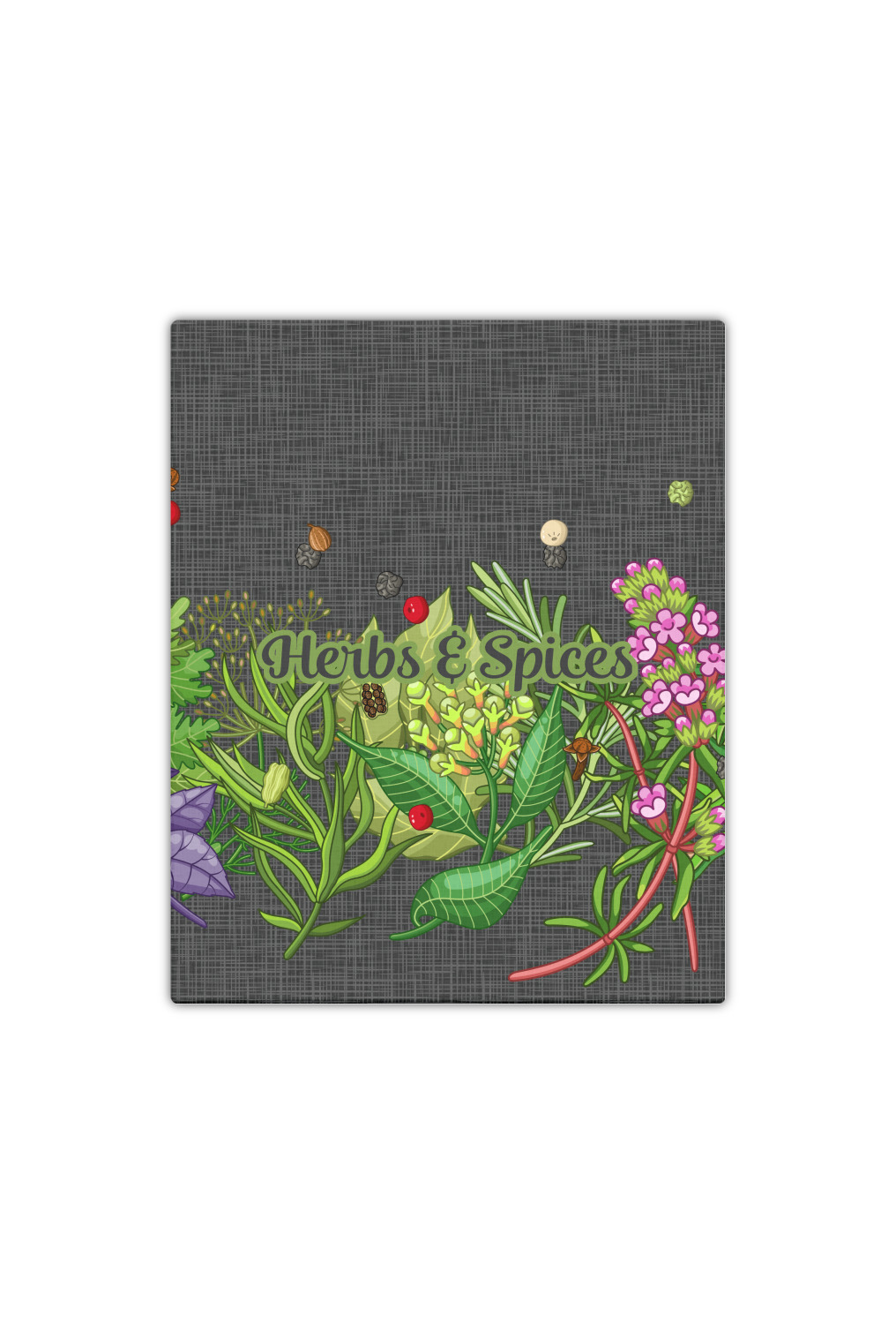 The design features an adorable frame of illustrated peppers, garlic, ginger, and other herbs. The background is a subtle texture in a charcoal color. A fun ribbon made with other spices and herbs makes the coordinating design. Both are easily personalized.