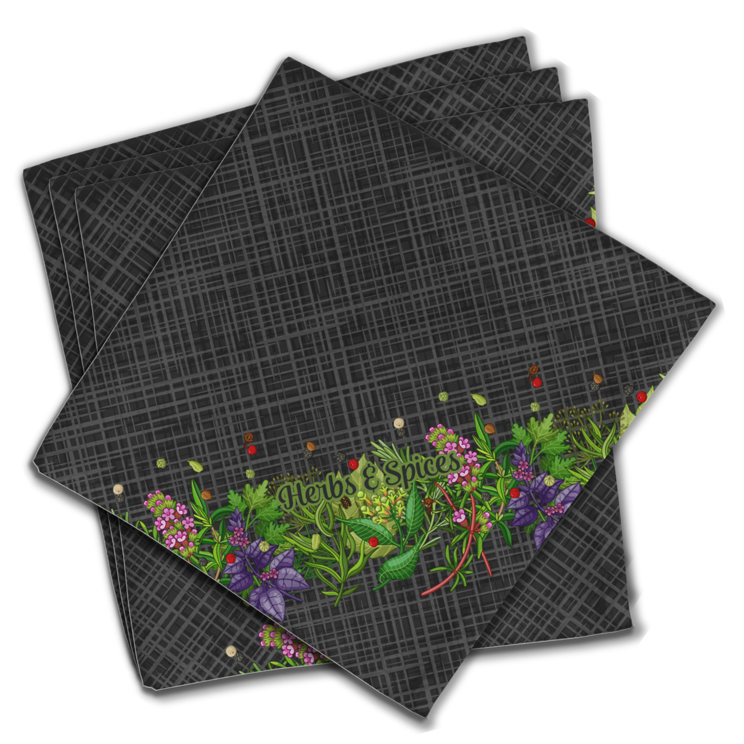 The design features an adorable frame of illustrated peppers, garlic, ginger, and other herbs. The background is a subtle texture in a charcoal color. A fun ribbon made with other spices and herbs makes the coordinating design. Both are easily personalized.