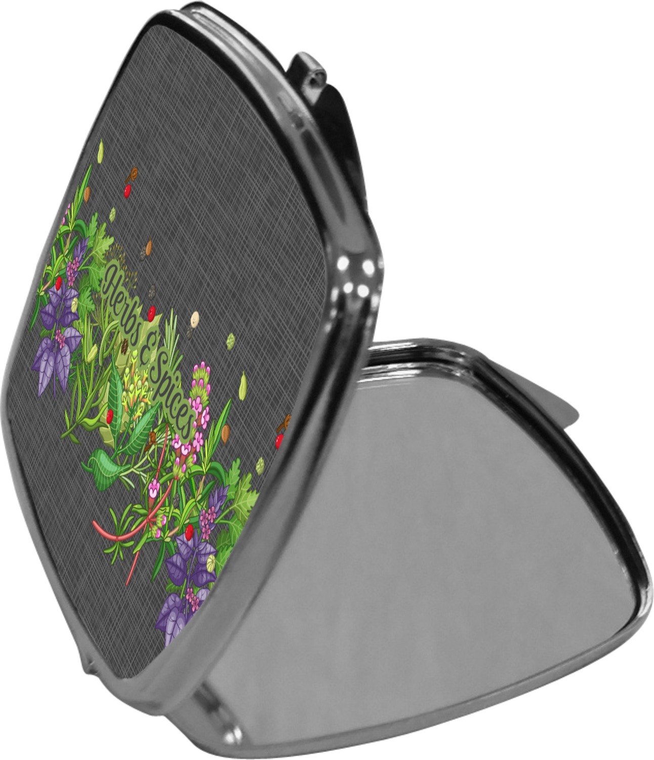 Our compact mirrors are customized with your design on one side. The other side is patterned silver tone metal. Inside, there are two mirrors.