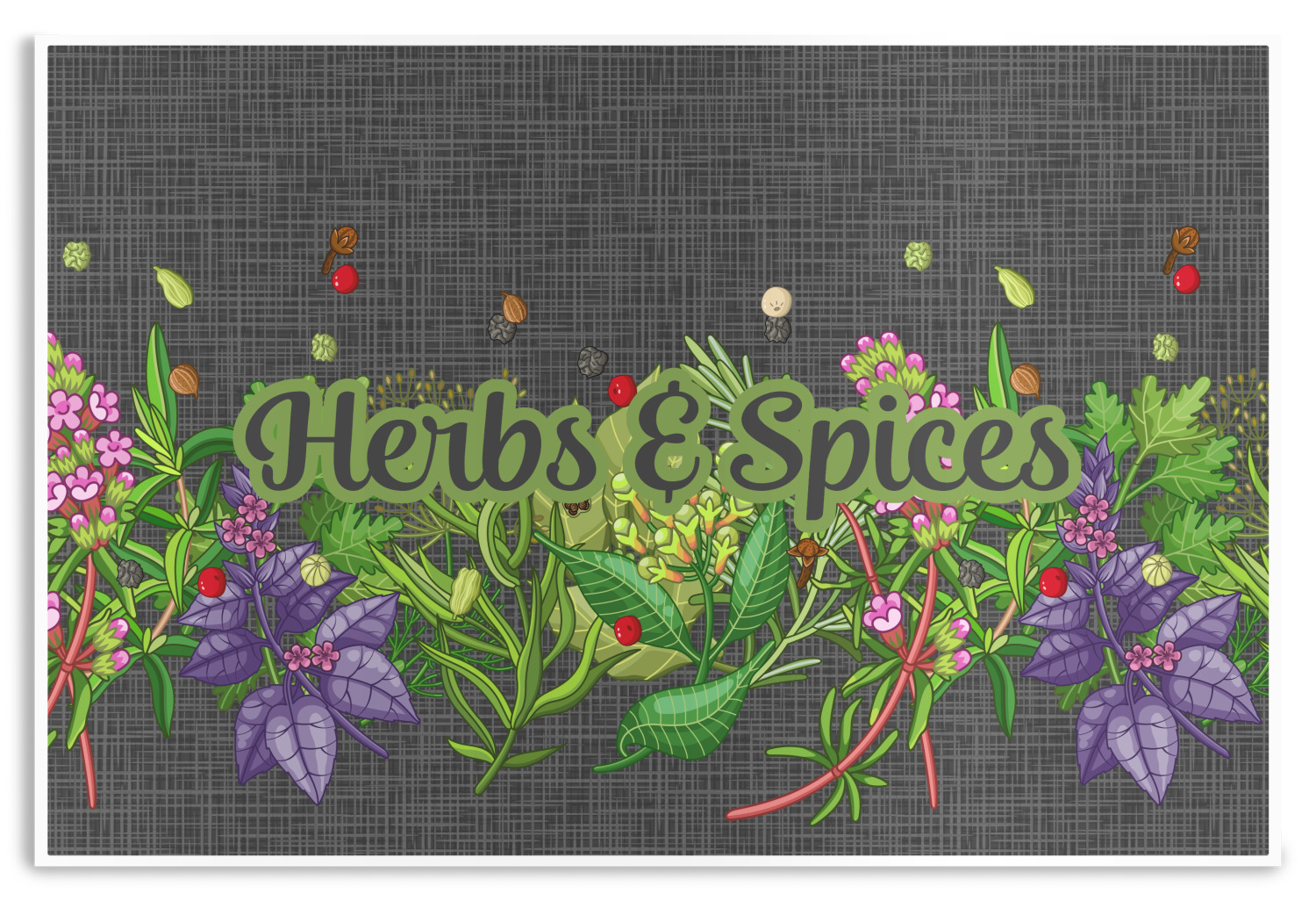 The design features an adorable frame of illustrated peppers, garlic, ginger, and other herbs. The background is a subtle texture in a charcoal color. A fun ribbon made with other spices and herbs makes the coordinating design. Both are easily personalized.