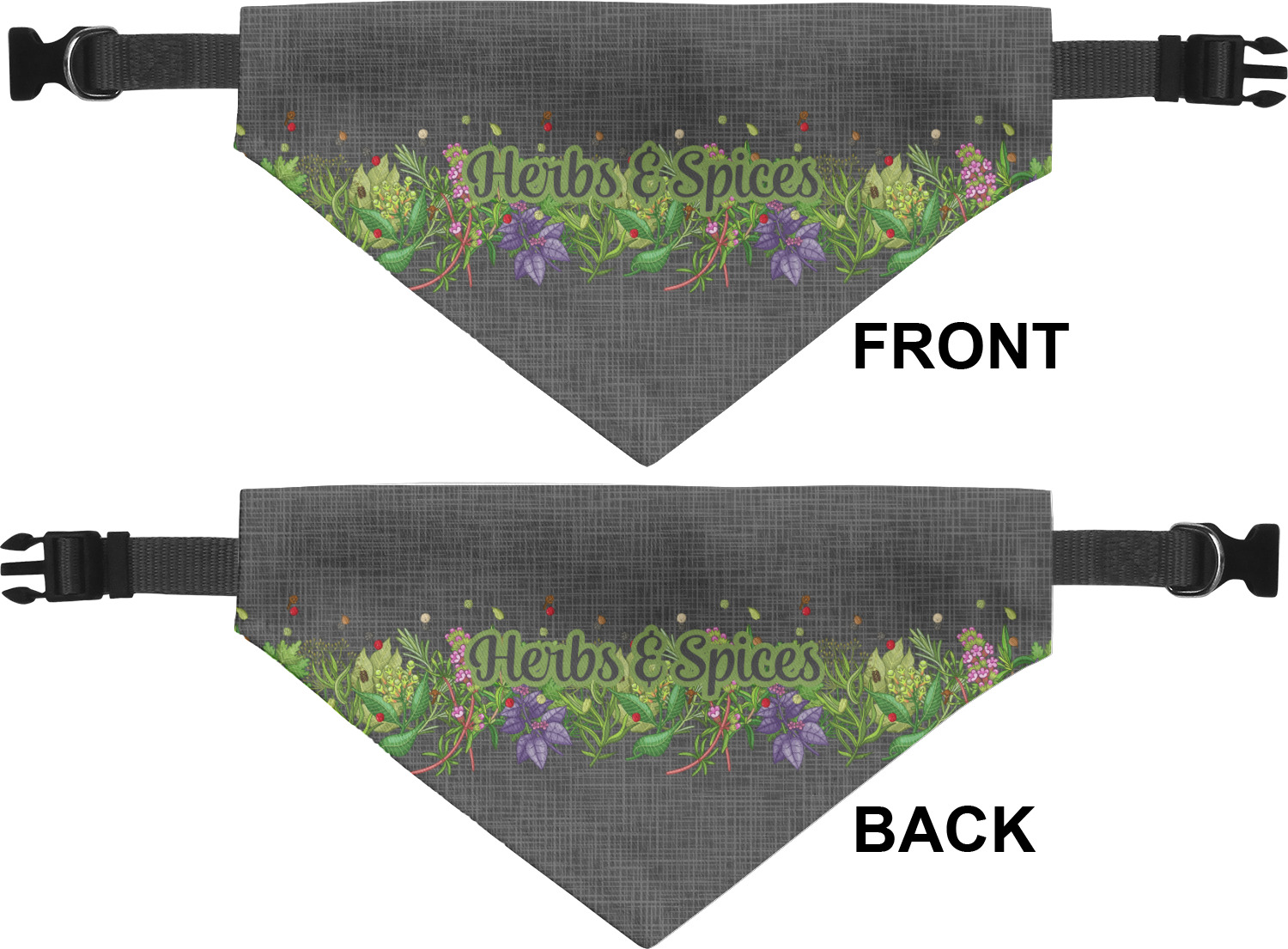 We print the front and back of these dog bandanas with your customized design. The bandana itself is made from a durable polyester, sewn together with a gap large enough to accommodate any collar. Regardless, the bandana includes a plain black, canvas collar with plastic snaps, that can easily be removed if desired. These dog bandana collars are available in four sizes: small, medium, large, and extra large. Please see our sizing chart for more information regarding the dimensions of each size.