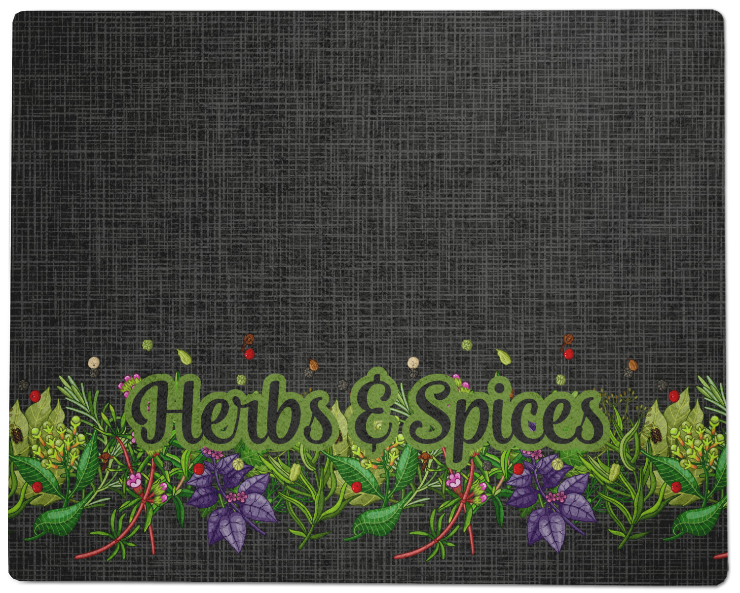 The design features an adorable frame of illustrated peppers, garlic, ginger, and other herbs. The background is a subtle texture in a charcoal color. A fun ribbon made with other spices and herbs makes the coordinating design. Both are easily personalized.