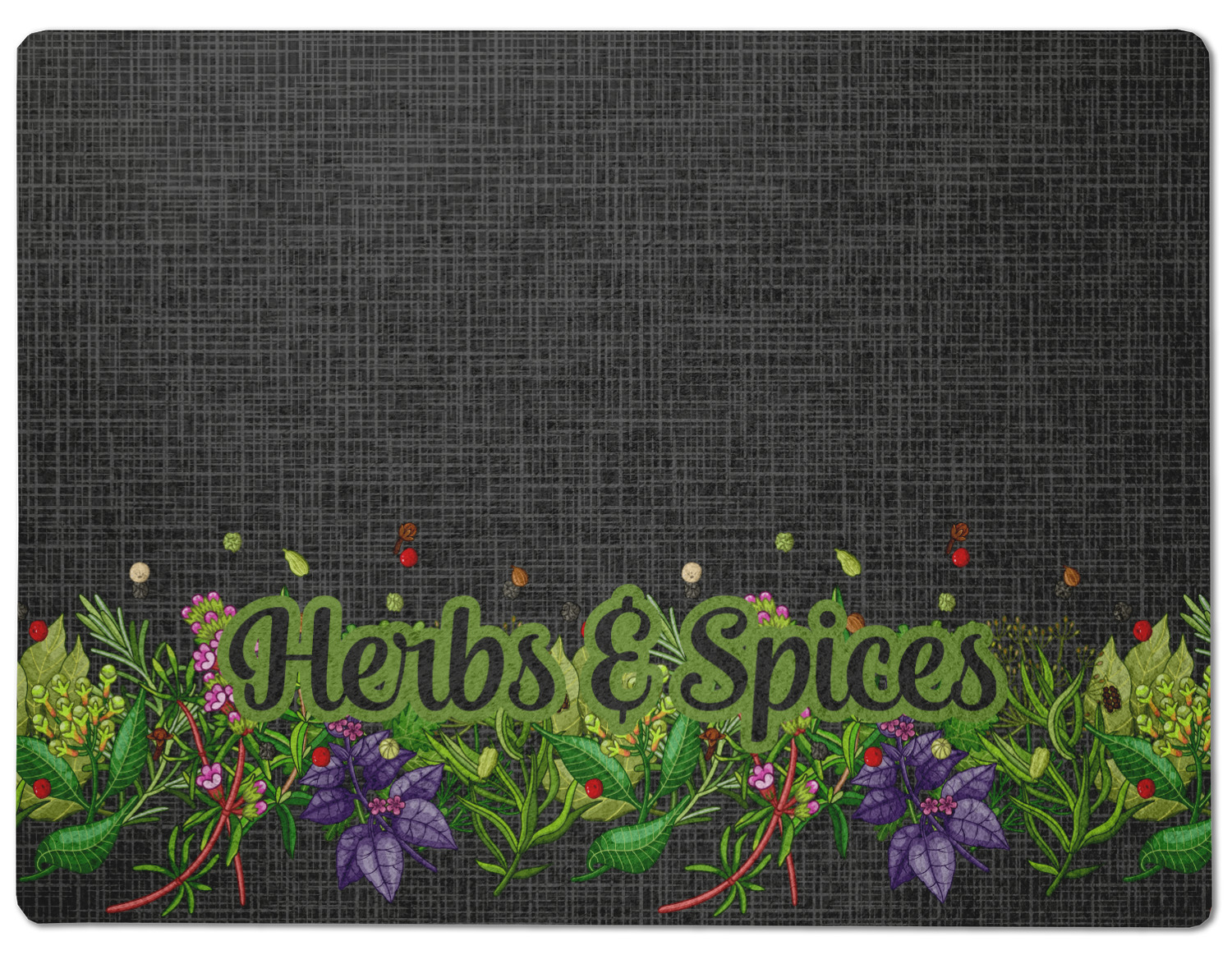 The design features an adorable frame of illustrated peppers, garlic, ginger, and other herbs. The background is a subtle texture in a charcoal color. A fun ribbon made with other spices and herbs makes the coordinating design. Both are easily personalized.