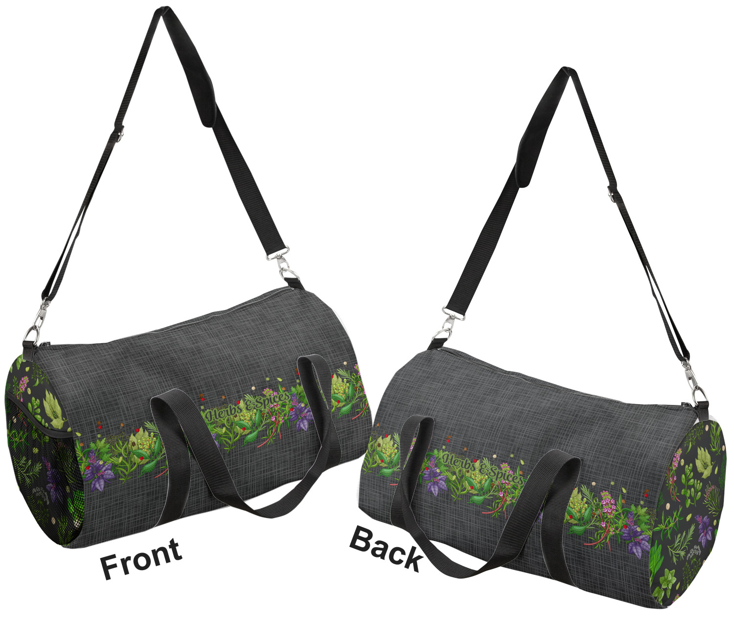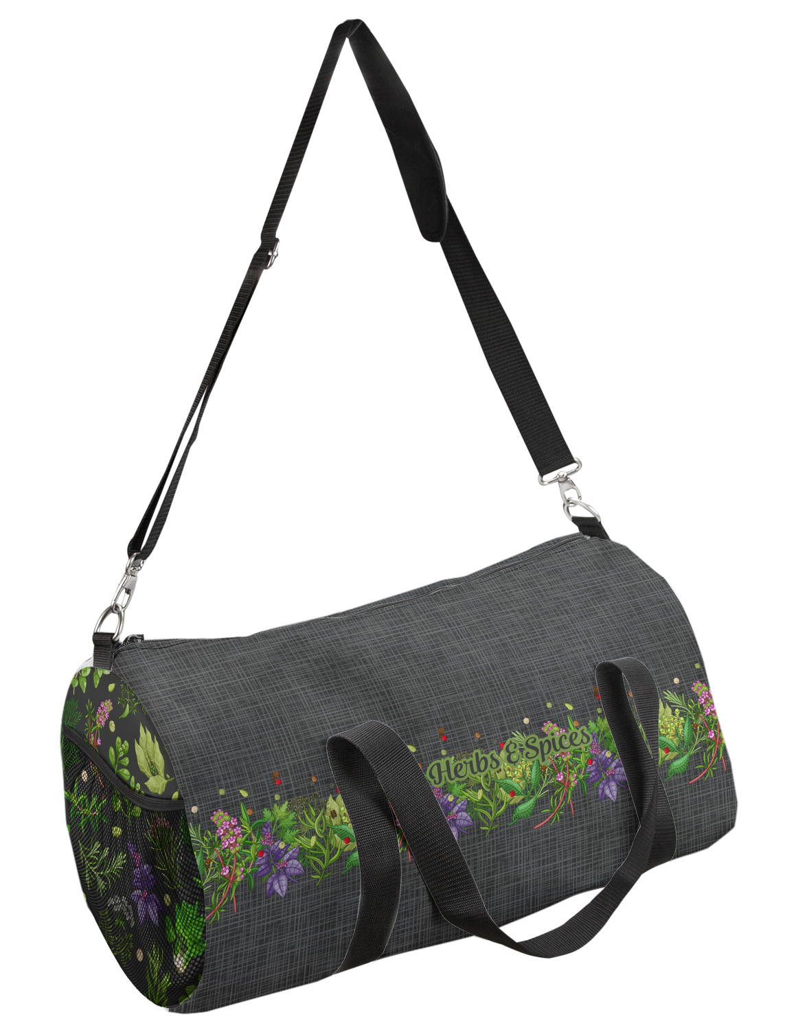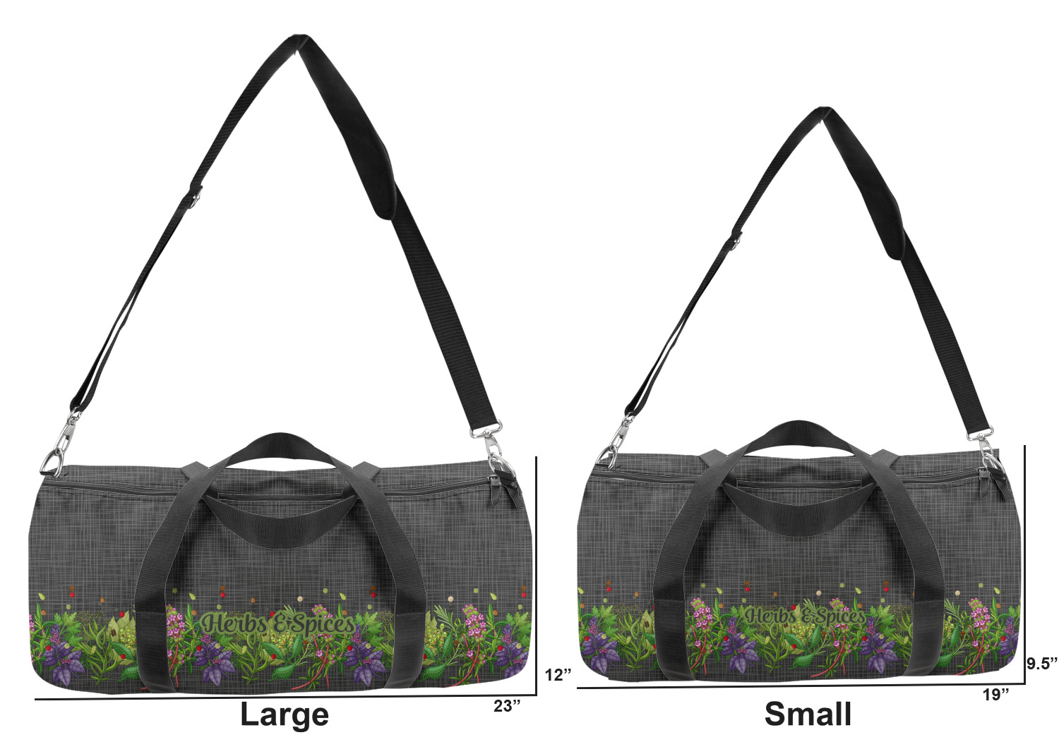 This duffle is a sturdy bag made of a canvas material. It comes in two sizes: Small (19"W x 9.5"H x 9.5"D) and Large (23"W x 12"H x 12"D). The bag is a cylindrical shape with a black adjustable strap and two handles. On one side is an elastic pouch to put a waterbottle or other small item. Your product will be sublimated with your design and is able to be designed on the front, back, and sides. Be sure to remember that the straps may cut into parts of your design if you upload your own artwork.
