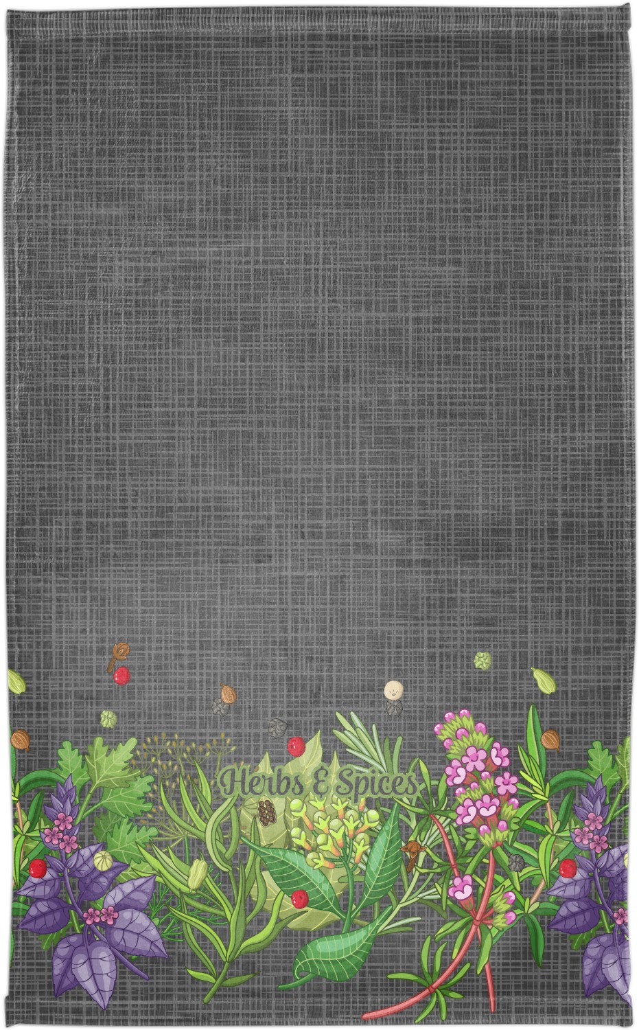 The design features an adorable frame of illustrated peppers, garlic, ginger, and other herbs. The background is a subtle texture in a charcoal color. A fun ribbon made with other spices and herbs makes the coordinating design. Both are easily personalized.