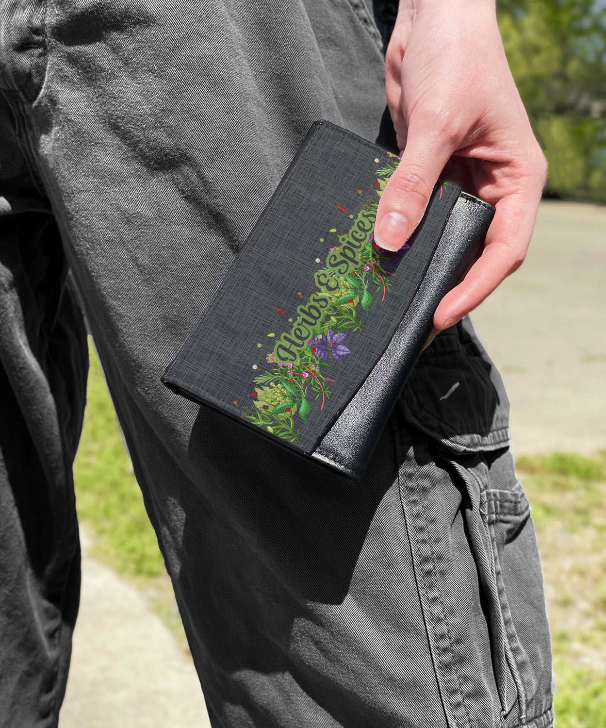 The compact size of this wallet - 5.5in wide, 3.5in tall and 0.75in thick when folded - makes it perfect to hold in hand and small enough to fit in a clutch or a normal size purse. The outside flap is customized with your choice of artwork and closes with a snap closure - with two different snaps to allow it to be adjusted when storing more items - to securely fasten the flap.
