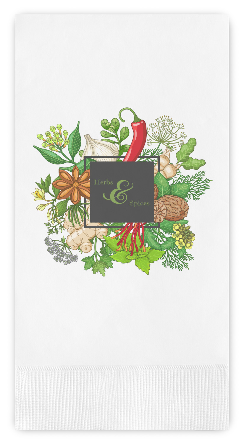 The design features an adorable frame of illustrated peppers, garlic, ginger, and other herbs. The background is a subtle texture in a charcoal color. A fun ribbon made with other spices and herbs makes the coordinating design. Both are easily personalized.