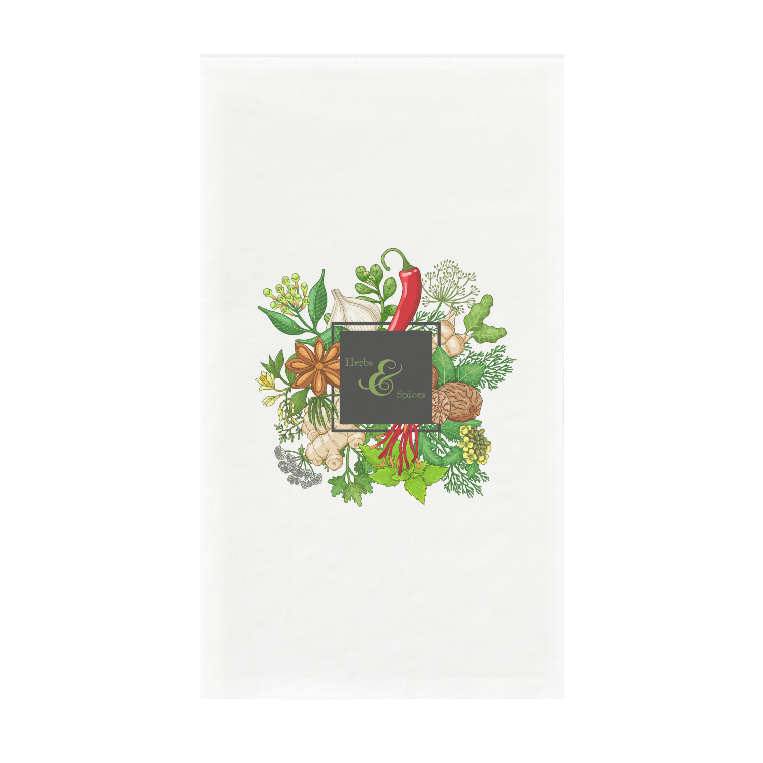 The design features an adorable frame of illustrated peppers, garlic, ginger, and other herbs. The background is a subtle texture in a charcoal color. A fun ribbon made with other spices and herbs makes the coordinating design. Both are easily personalized.