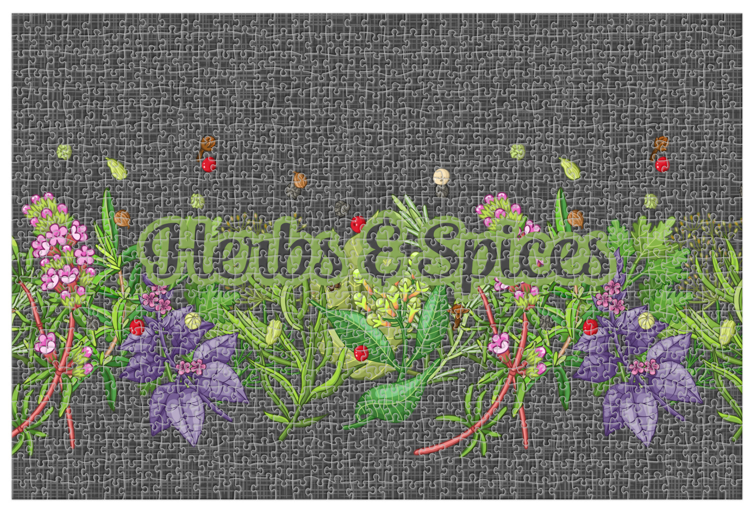 The design features an adorable frame of illustrated peppers, garlic, ginger, and other herbs. The background is a subtle texture in a charcoal color. A fun ribbon made with other spices and herbs makes the coordinating design. Both are easily personalized.