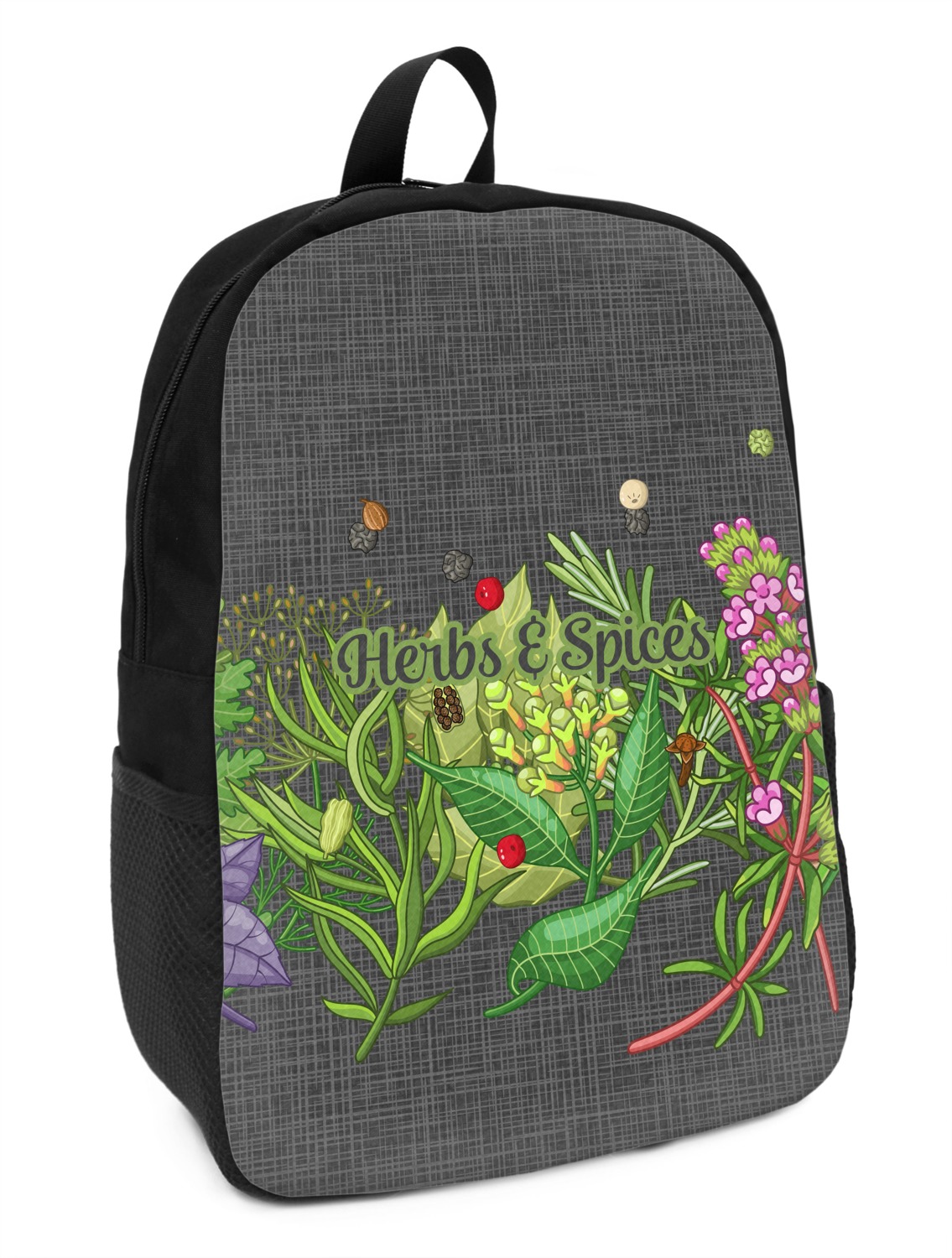 These small backpacks are made of a durable black canvas material with your personalization right on the front. The two shoulder straps are padded and easily adjustable. The bag itself measures at about 11" W x 15" H x 5" D. It's the perfect size for elementary aged kids or adults who want a smaller backpack. On the top of the bag you will find a handle to hang or carry your backpack by as well as a large zipper closure to keep all of your belongings safe inside. On each side of your backpack is a mesh pocket for a small item or water bottle. Inside your backpack you will find a spacious area with a small zipper pocket and a padded laptop slot that will fit up to a 13" laptop (13" being very snug). This is the perfect bag for any student that needs a couple books and their laptop with them at all times. It also works great as a carry on for traveling!