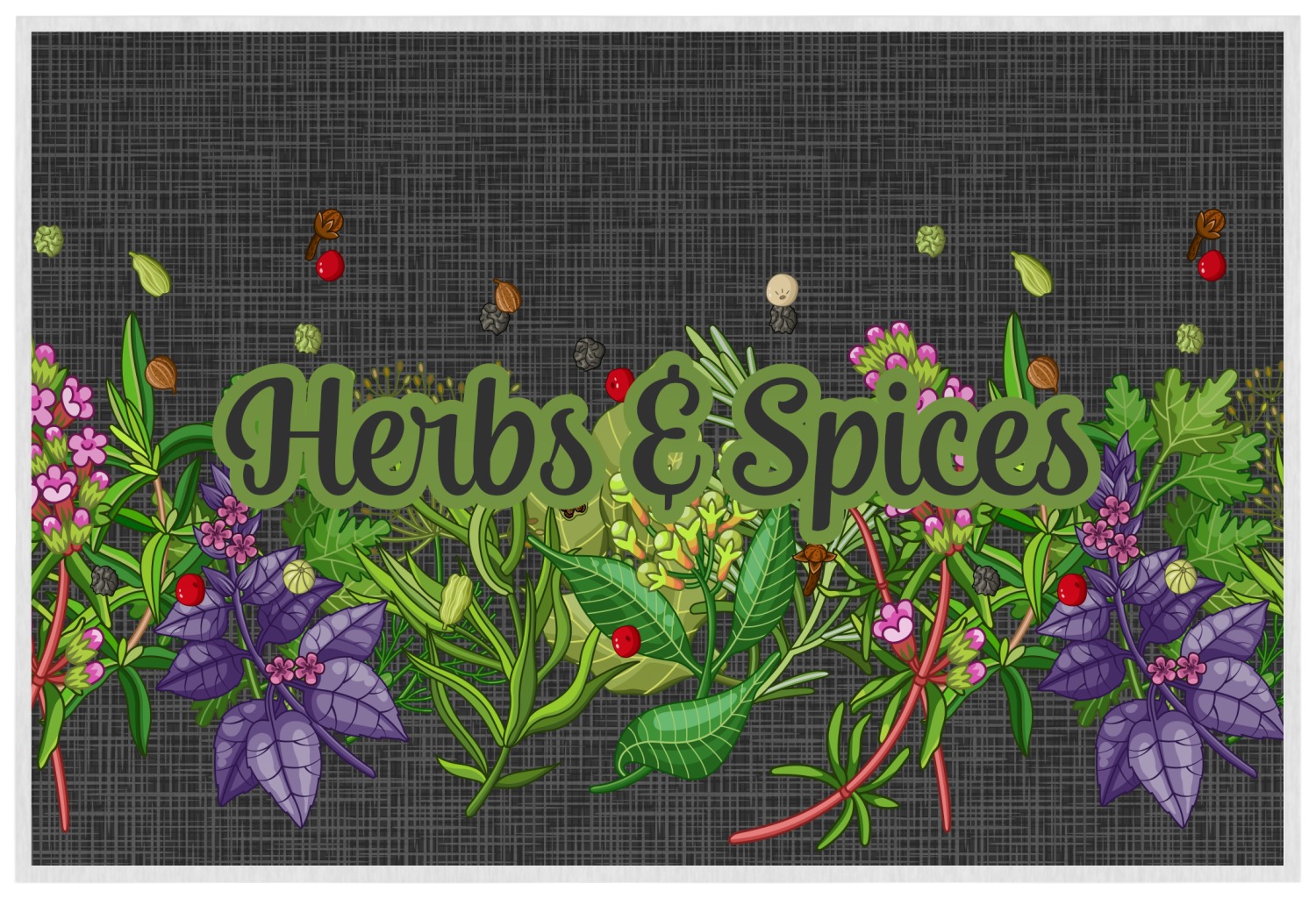 The design features an adorable frame of illustrated peppers, garlic, ginger, and other herbs. The background is a subtle texture in a charcoal color. A fun ribbon made with other spices and herbs makes the coordinating design. Both are easily personalized.