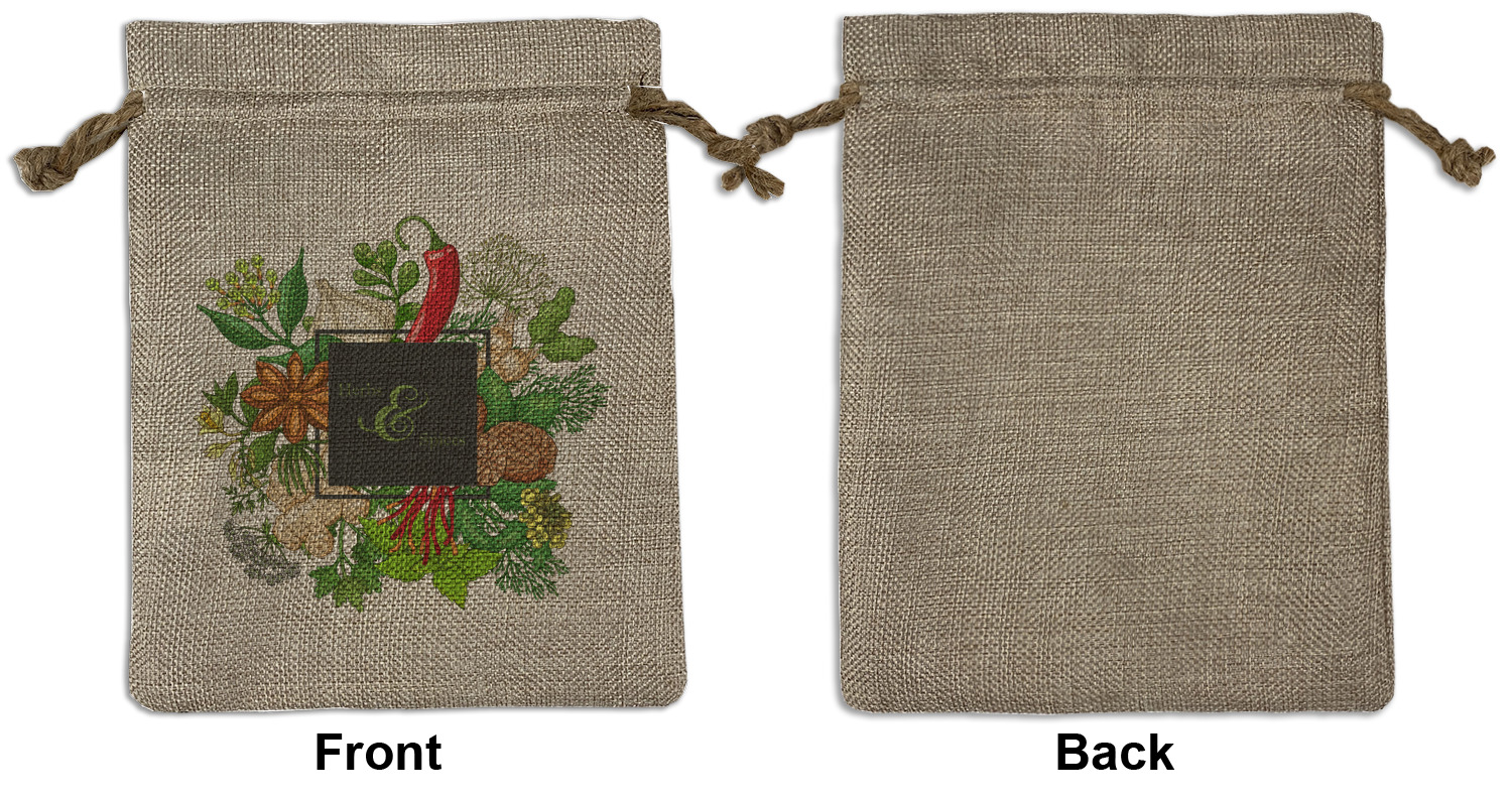We sell our Burlap Gift Bags in 3 variant sized bags. Made with burlap polyester, each personalized bag can be secured with a twine drawstring pull. Your custom design is available to print on one side or both sides - completely up to you! The sizes of the bags measure approximately 4.5" x 6.5" for the smallest size, 6.5" x 8.0" for the medium size, and 6.5" x 13.5" for the large-sized bag.