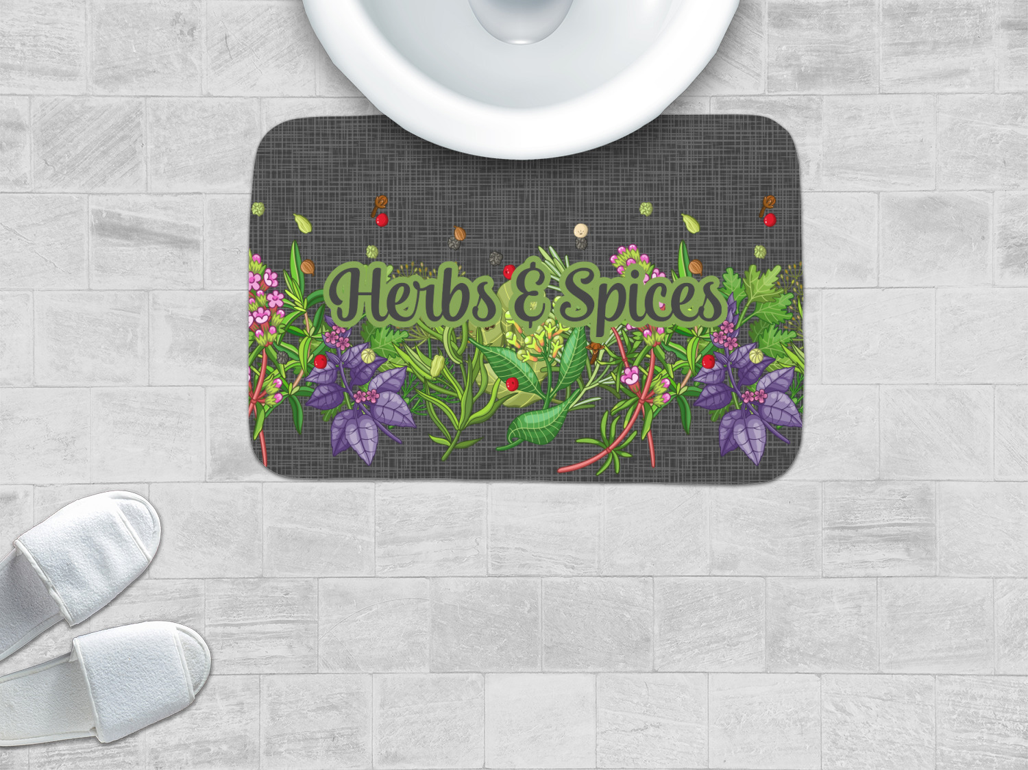 The design features an adorable frame of illustrated peppers, garlic, ginger, and other herbs. The background is a subtle texture in a charcoal color. A fun ribbon made with other spices and herbs makes the coordinating design. Both are easily personalized.