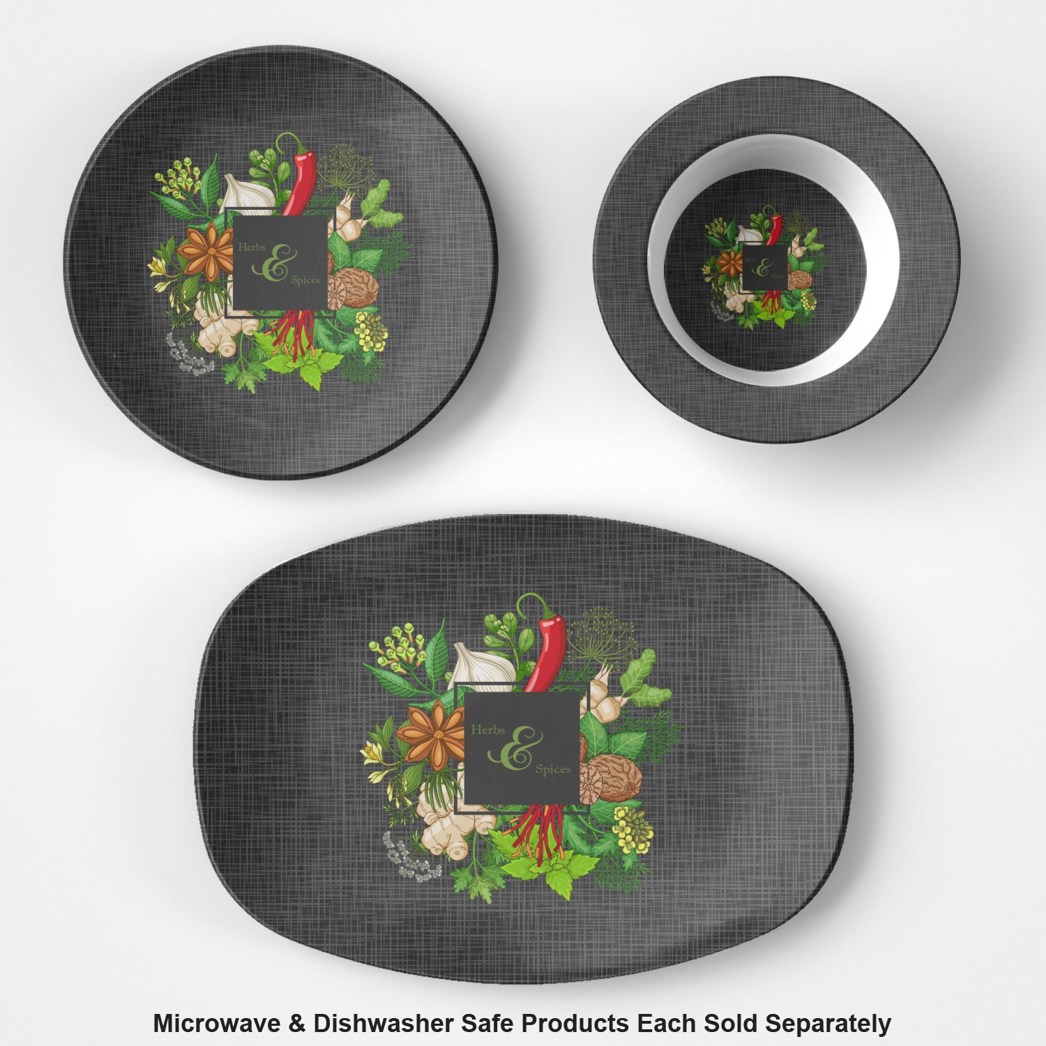The design features an adorable frame of illustrated peppers, garlic, ginger, and other herbs. The background is a subtle texture in a charcoal color. A fun ribbon made with other spices and herbs makes the coordinating design. Both are easily personalized.