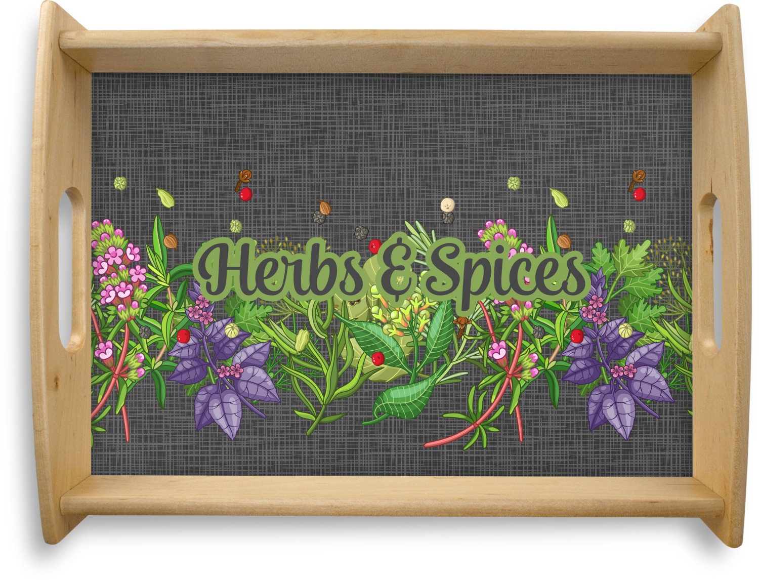This serving tray with handles features square edges and two rounded sides, creating a very modern look. Each side is fabricated from a beautifully cut, natural wood. The bottom of the interior of the tray displays your customized design in bright, vibrant color. The tray is sold in both a black color and a natural wood look. Each variation of the wood serving tray has two sizes: Small, which is 14" x 10" x 2.25", and Large, which is 19.5" x 13.5" x 2.75".