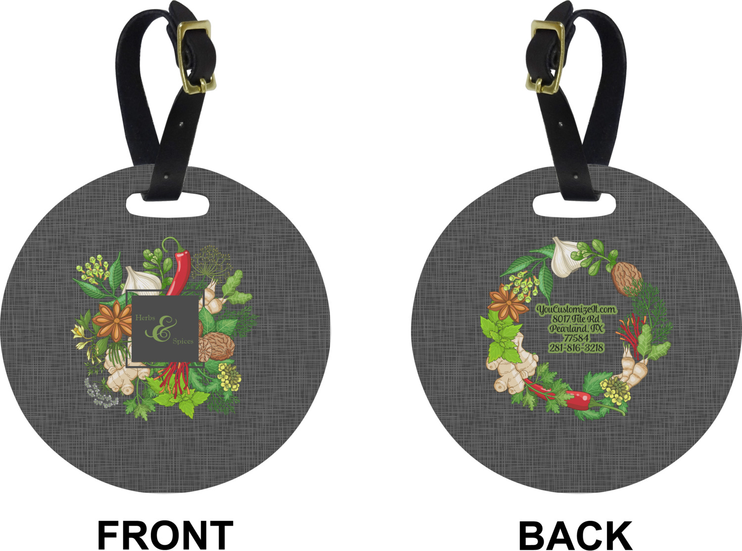 These personalized bag tags are sold in a variety of shapes, so that you may find the product that meets your vision exactly. We sell a round luggage tag, which measures at approximately 4" x 4". Our square luggage tag is about 3.5" x 3.5", while our rectangular version is 2.75" x 4 ".