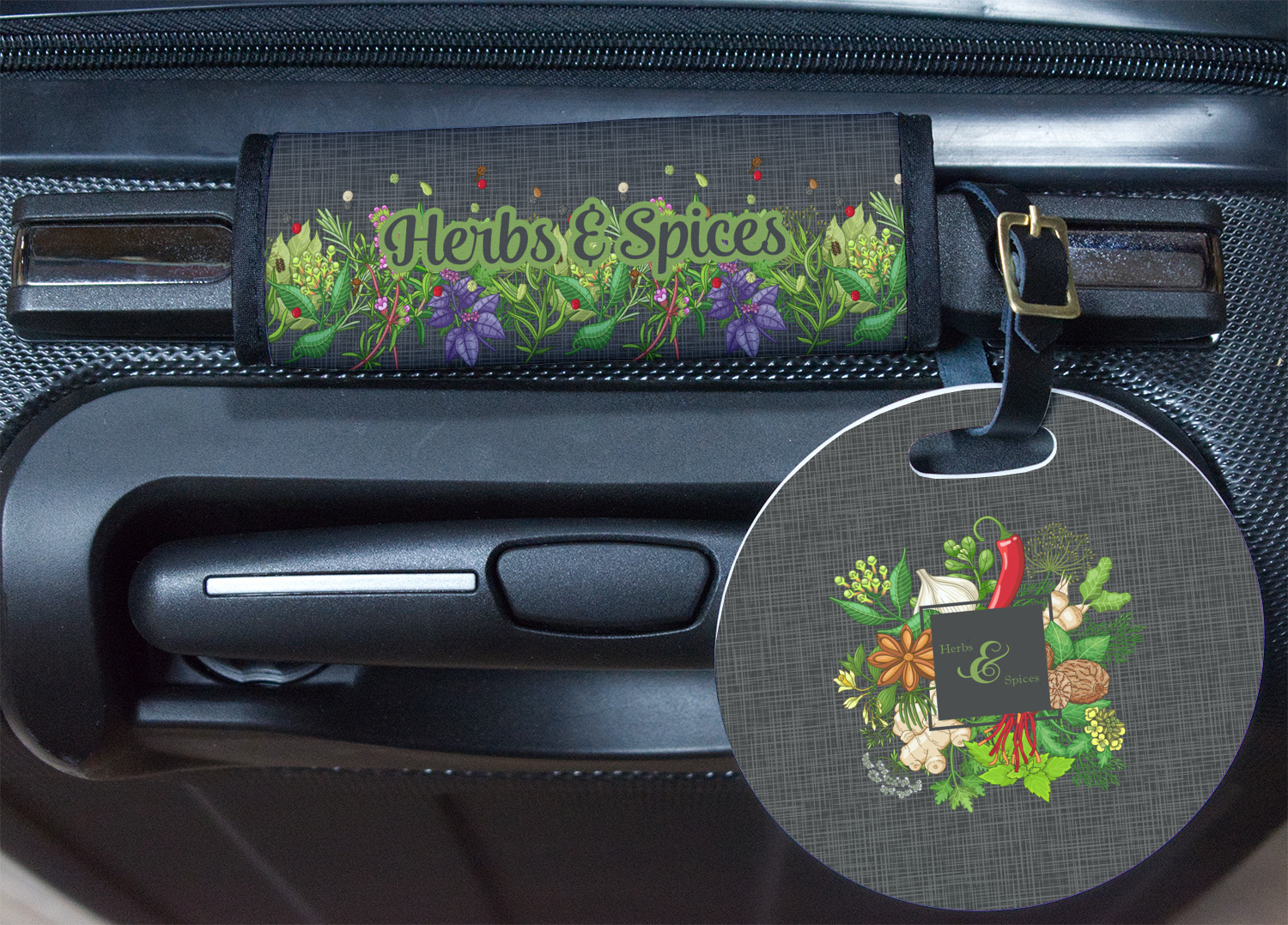 The design features an adorable frame of illustrated peppers, garlic, ginger, and other herbs. The background is a subtle texture in a charcoal color. A fun ribbon made with other spices and herbs makes the coordinating design. Both are easily personalized.
