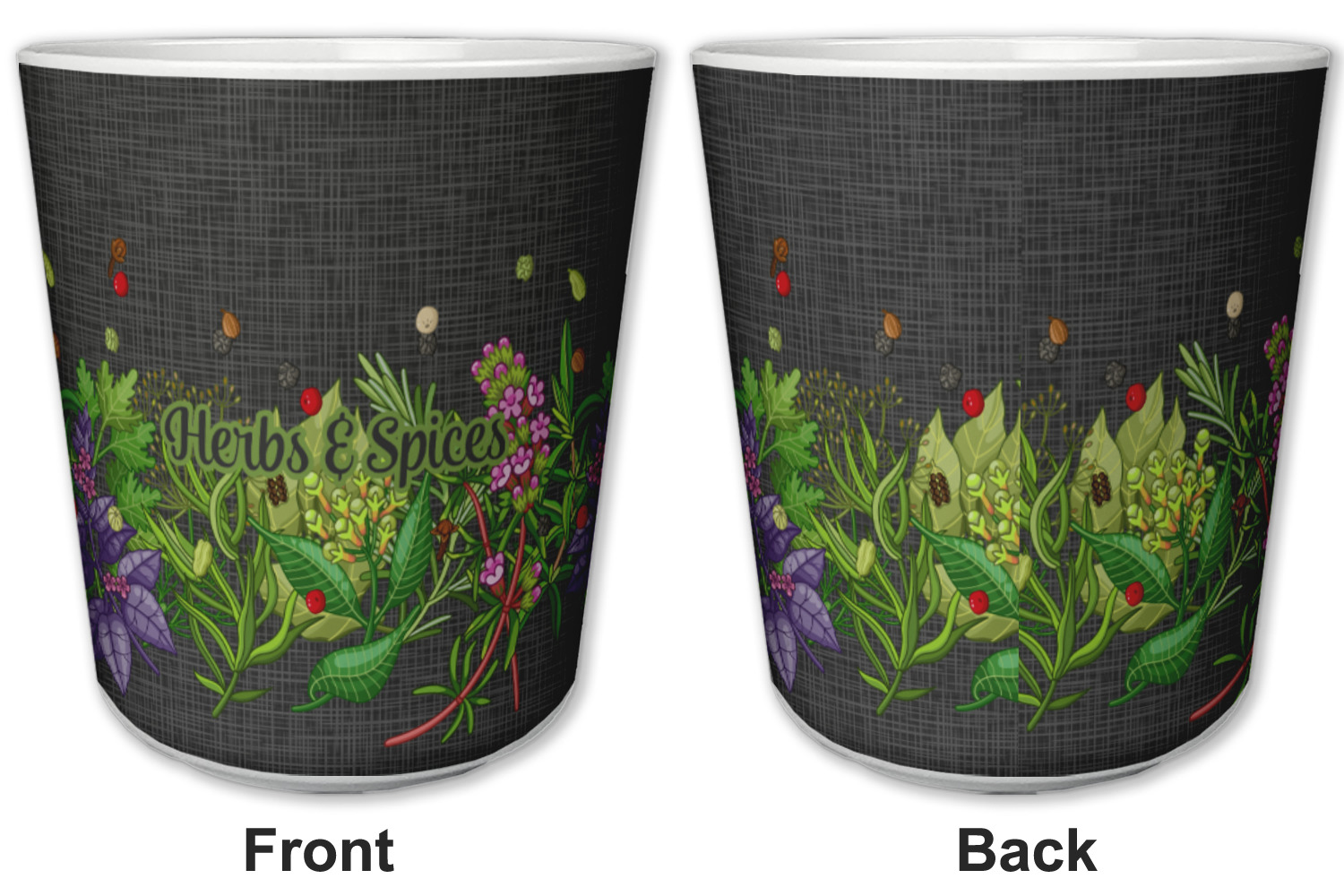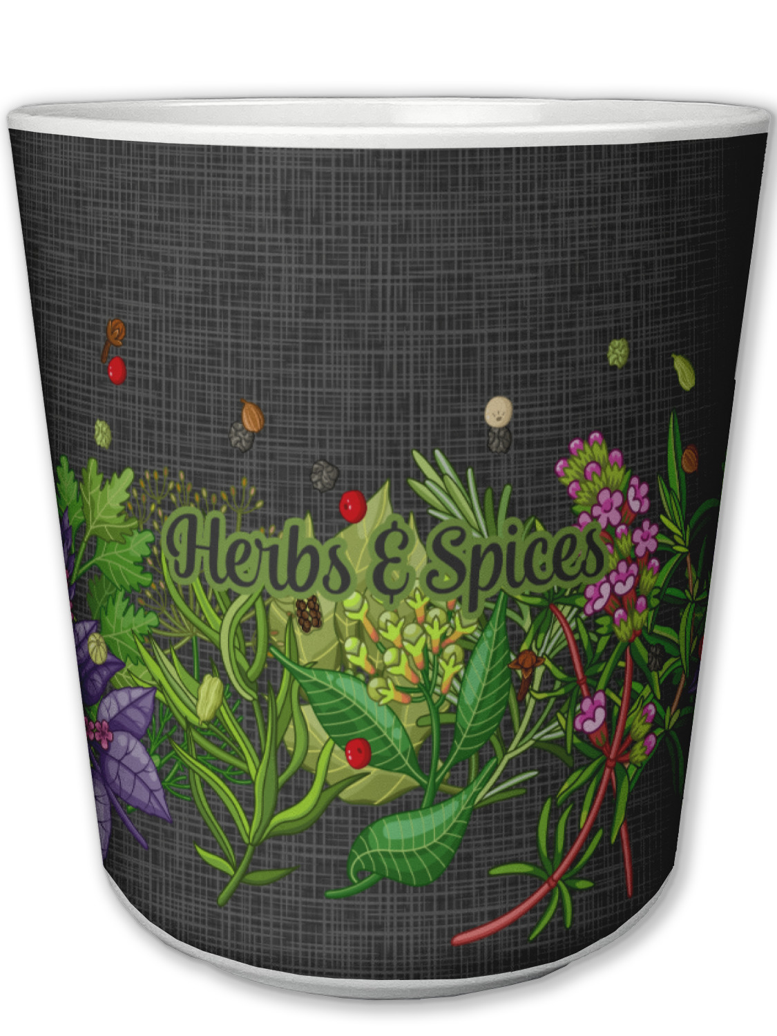 The design features an adorable frame of illustrated peppers, garlic, ginger, and other herbs. The background is a subtle texture in a charcoal color. A fun ribbon made with other spices and herbs makes the coordinating design. Both are easily personalized.