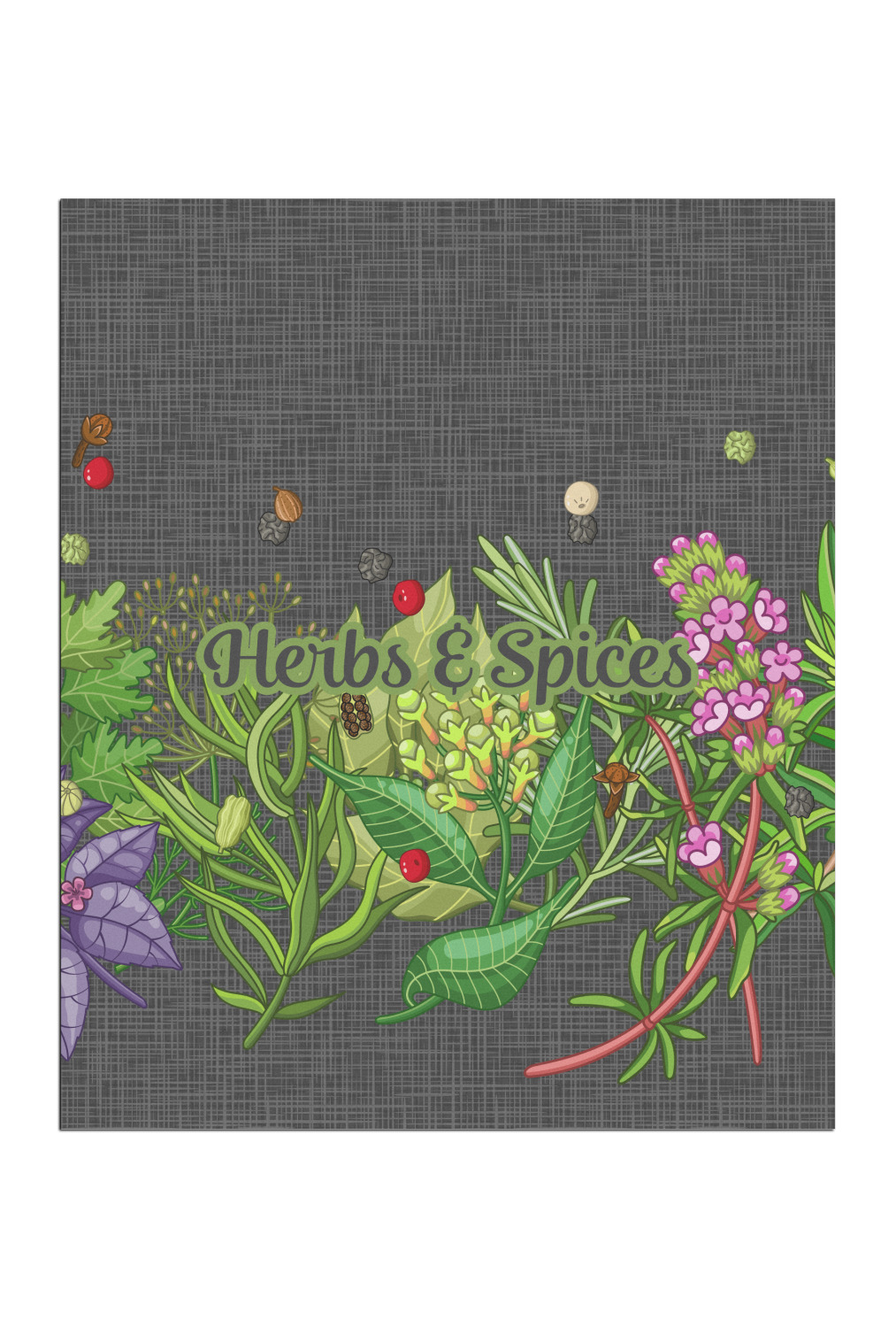The design features an adorable frame of illustrated peppers, garlic, ginger, and other herbs. The background is a subtle texture in a charcoal color. A fun ribbon made with other spices and herbs makes the coordinating design. Both are easily personalized.