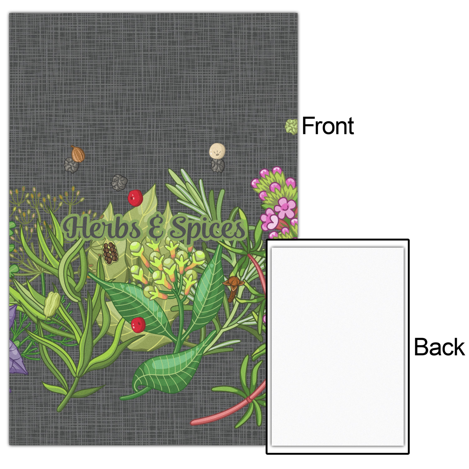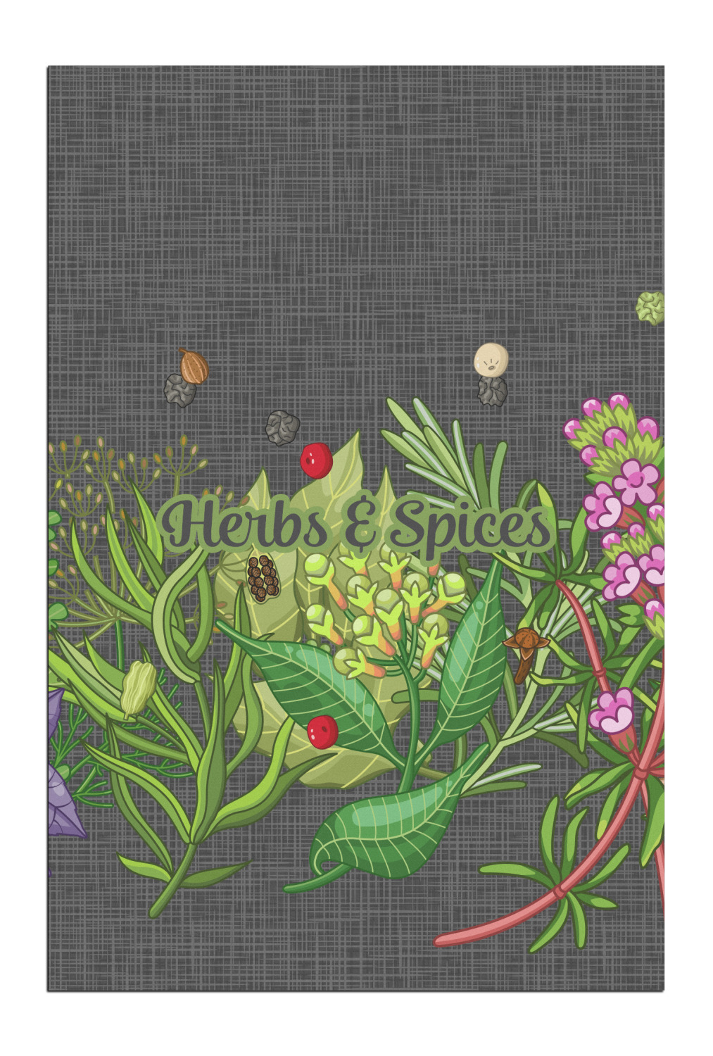 The design features an adorable frame of illustrated peppers, garlic, ginger, and other herbs. The background is a subtle texture in a charcoal color. A fun ribbon made with other spices and herbs makes the coordinating design. Both are easily personalized.