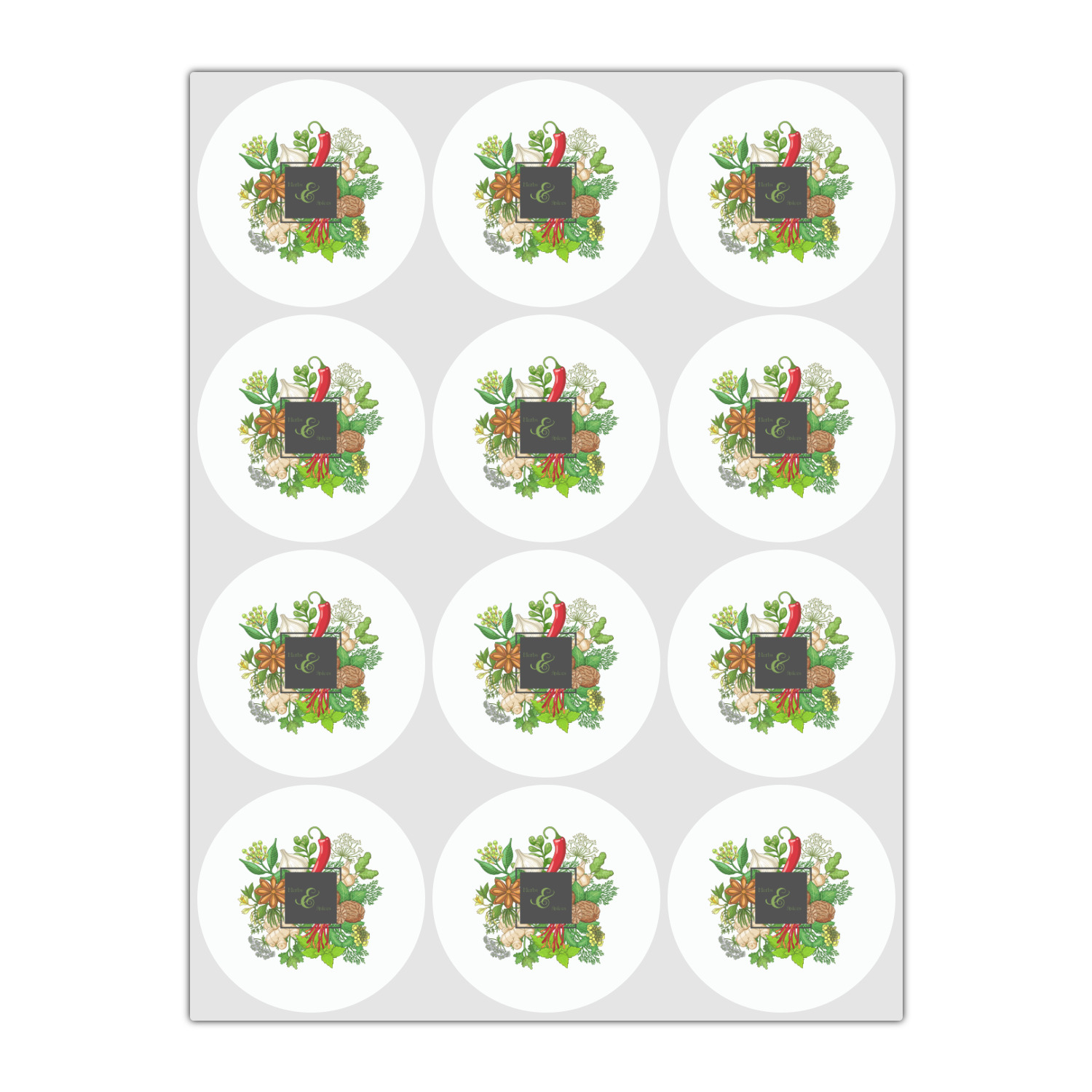 The design features an adorable frame of illustrated peppers, garlic, ginger, and other herbs. The background is a subtle texture in a charcoal color. A fun ribbon made with other spices and herbs makes the coordinating design. Both are easily personalized.
