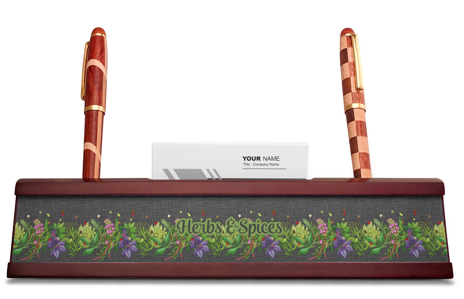 Your desk name plates are crafted from a high-quality, dark-cherry mahogany. At approximately 9.5 by 1.875 by 2.5 inches, this name plaque will fit perfectly, front and center, on your desk. Your customization spans across the entire face of the nameplate. Behind the nameplate lies a skinny slot that can fit approximately 15, traditionally-sized, business cards. You can also store your writing utensils on either side of this custom desk name plate.