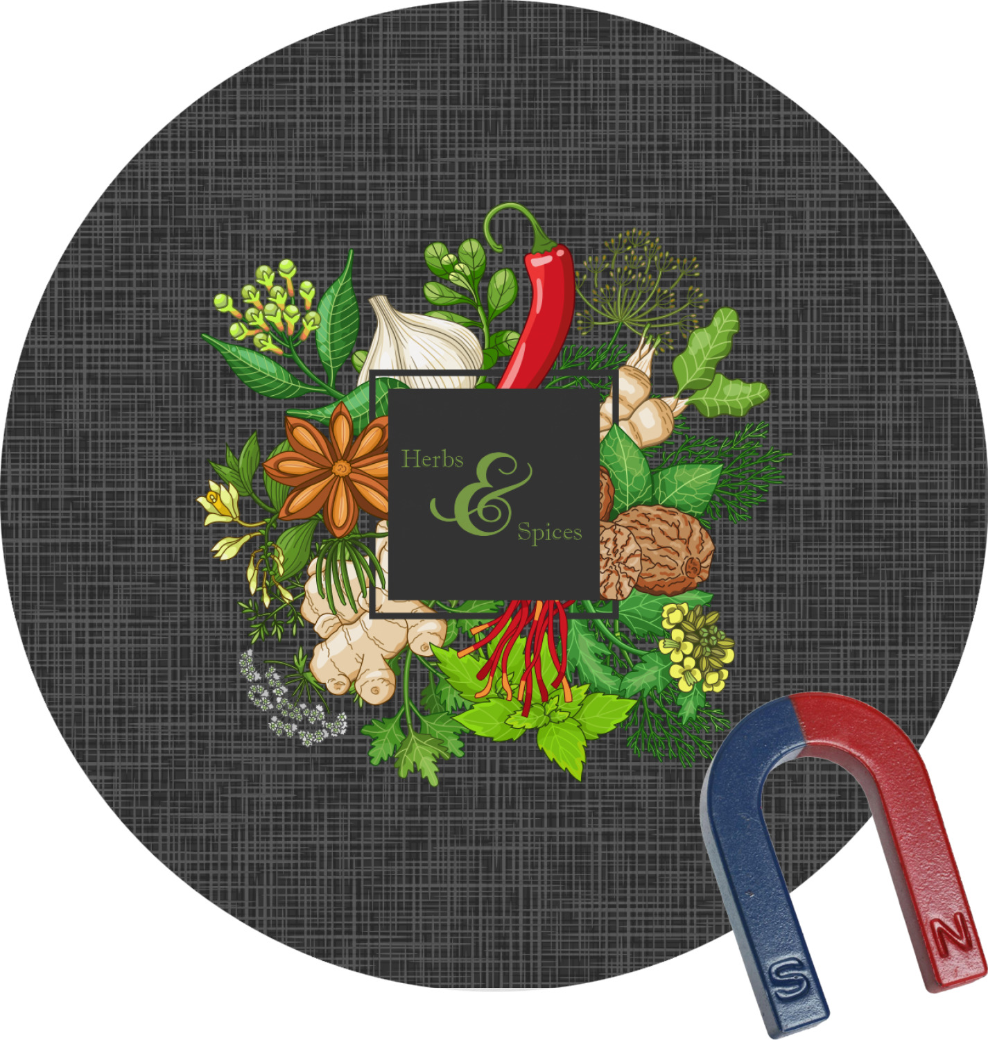 The design features an adorable frame of illustrated peppers, garlic, ginger, and other herbs. The background is a subtle texture in a charcoal color. A fun ribbon made with other spices and herbs makes the coordinating design. Both are easily personalized.