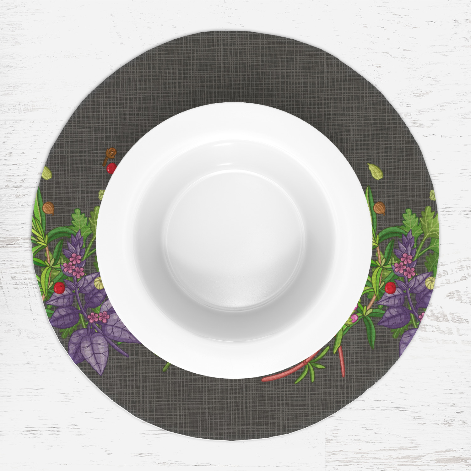 The design features an adorable frame of illustrated peppers, garlic, ginger, and other herbs. The background is a subtle texture in a charcoal color. A fun ribbon made with other spices and herbs makes the coordinating design. Both are easily personalized.