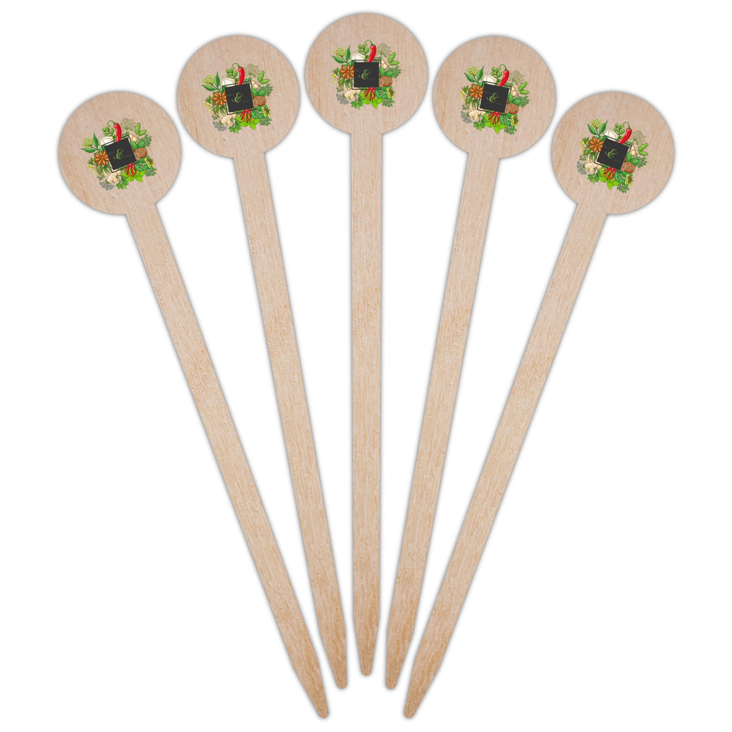 The design features an adorable frame of illustrated peppers, garlic, ginger, and other herbs. The background is a subtle texture in a charcoal color. A fun ribbon made with other spices and herbs makes the coordinating design. Both are easily personalized.