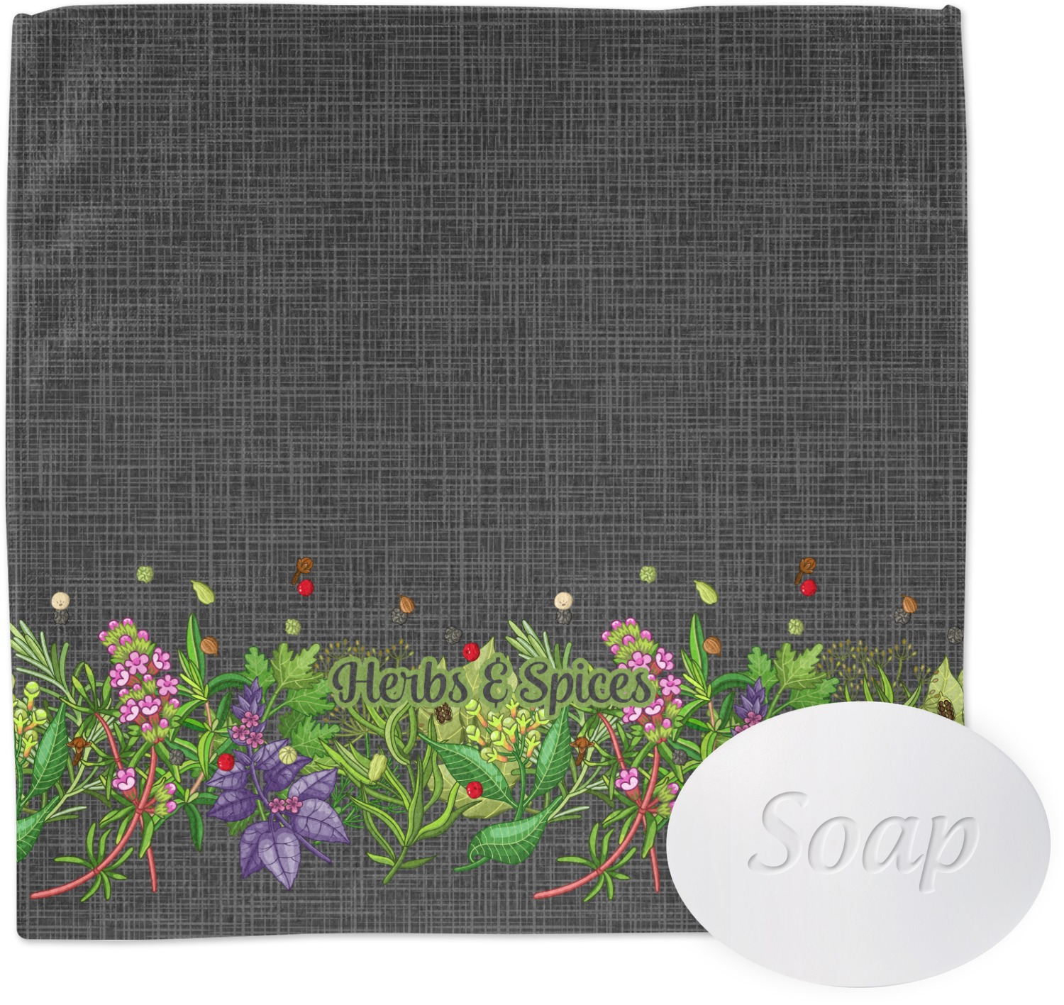 The design features an adorable frame of illustrated peppers, garlic, ginger, and other herbs. The background is a subtle texture in a charcoal color. A fun ribbon made with other spices and herbs makes the coordinating design. Both are easily personalized.