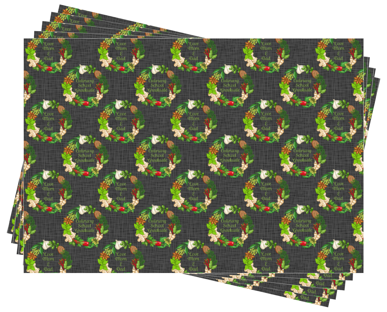 The design features an adorable frame of illustrated peppers, garlic, ginger, and other herbs. The background is a subtle texture in a charcoal color. A fun ribbon made with other spices and herbs makes the coordinating design. Both are easily personalized.