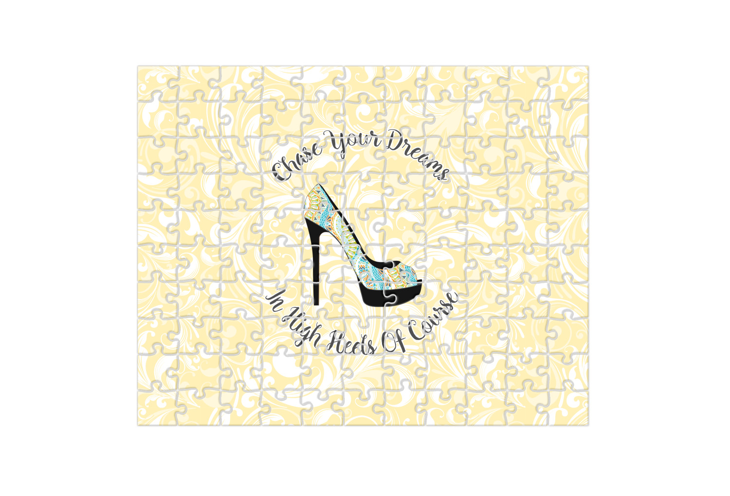 This High Heels Design with "Chase Your Dreams in High Heels Of Course" is simply beautiful. The design has a soft yellow leafy swirls background. The foreground is a beautiful stiletto high heel shoe filled with our abstract snakes pattern. We used our "graphic with arched text" style and have the words "Chase Your Dream" on top and "In High Heels of Course" on the bottom.