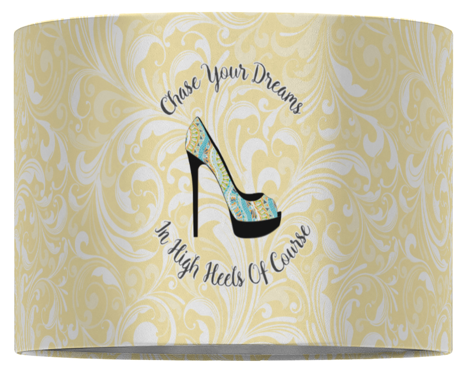 This High Heels Design with "Chase Your Dreams in High Heels Of Course" is simply beautiful. The design has a soft yellow leafy swirls background. The foreground is a beautiful stiletto high heel shoe filled with our abstract snakes pattern. We used our "graphic with arched text" style and have the words "Chase Your Dream" on top and "In High Heels of Course" on the bottom.