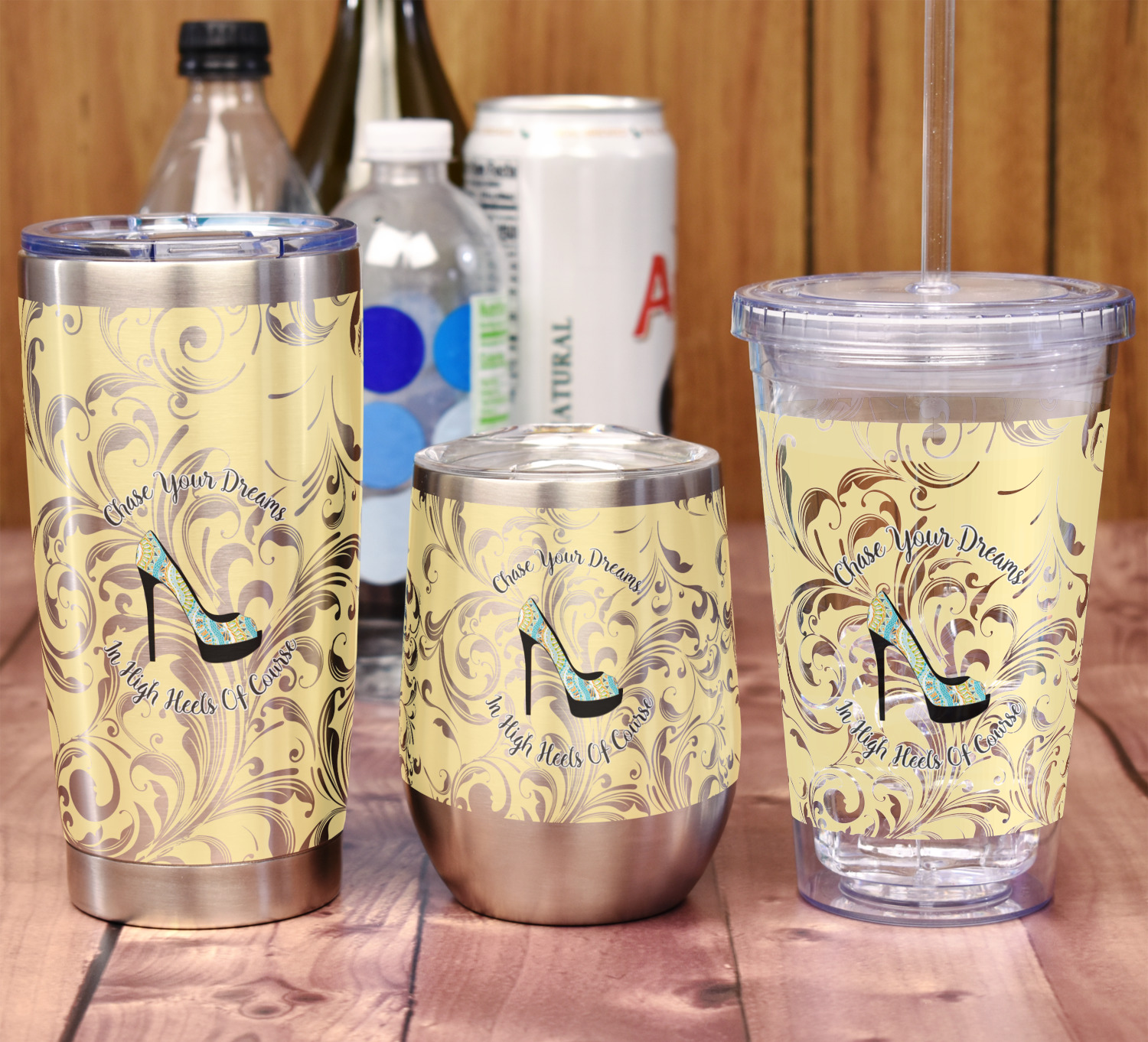 This High Heels Design with "Chase Your Dreams in High Heels Of Course" is simply beautiful. The design has a soft yellow leafy swirls background. The foreground is a beautiful stiletto high heel shoe filled with our abstract snakes pattern. We used our "graphic with arched text" style and have the words "Chase Your Dream" on top and "In High Heels of Course" on the bottom.