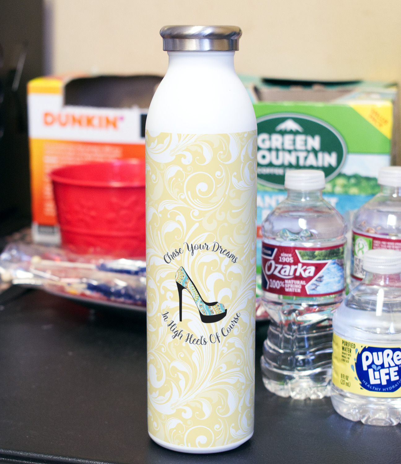 This High Heels Design with "Chase Your Dreams in High Heels Of Course" is simply beautiful. The design has a soft yellow leafy swirls background. The foreground is a beautiful stiletto high heel shoe filled with our abstract snakes pattern. We used our "graphic with arched text" style and have the words "Chase Your Dream" on top and "In High Heels of Course" on the bottom.