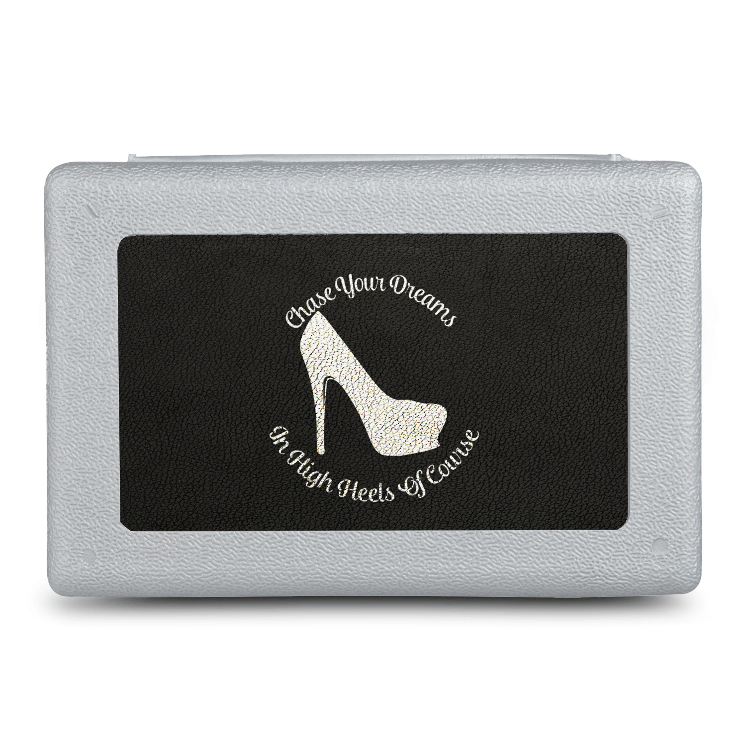 This High Heels Design with "Chase Your Dreams in High Heels Of Course" is simply beautiful. The design has a soft yellow leafy swirls background. The foreground is a beautiful stiletto high heel shoe filled with our abstract snakes pattern. We used our "graphic with arched text" style and have the words "Chase Your Dream" on top and "In High Heels of Course" on the bottom.