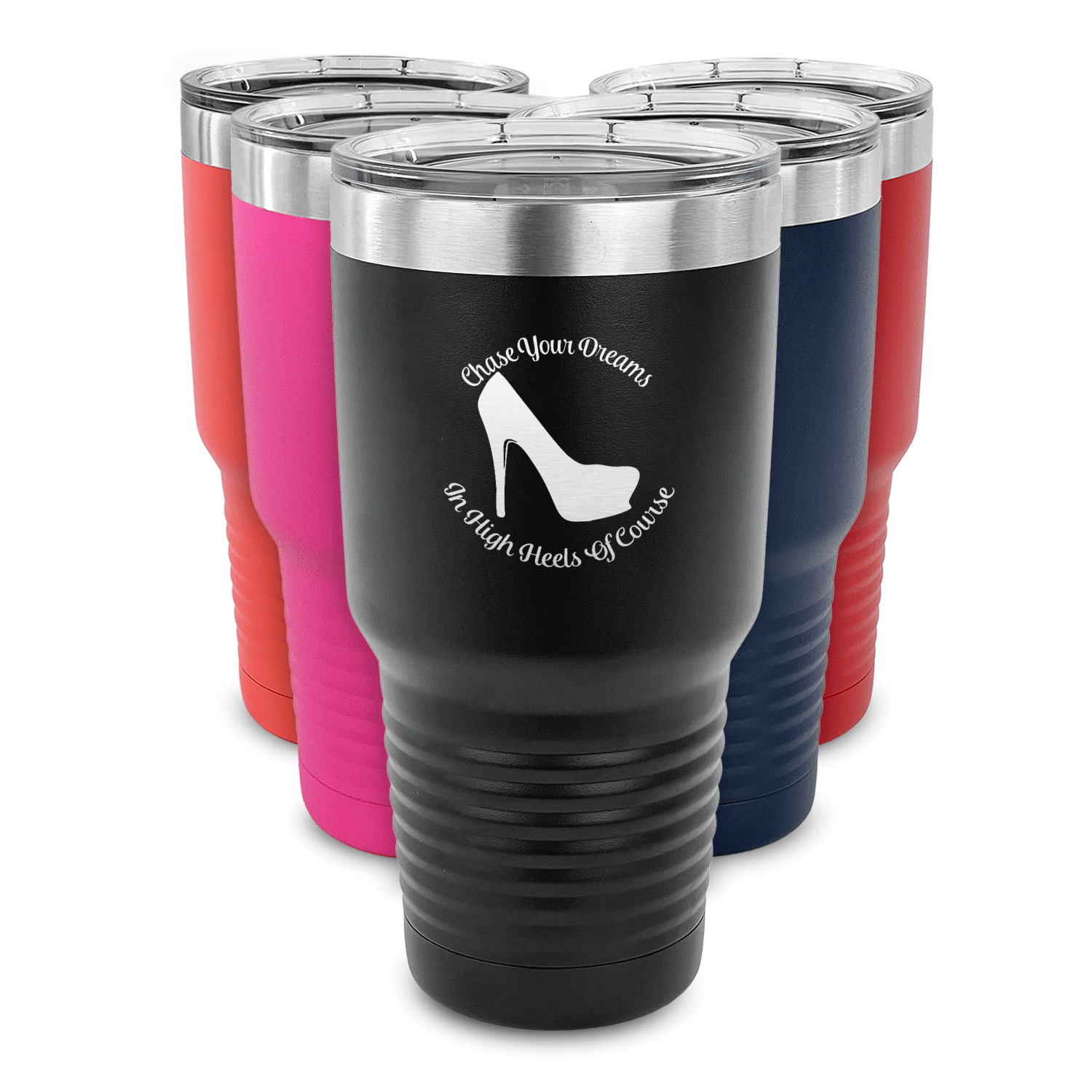 With the 5 colors - Black, Navy, Red, Pink and Coral, you are sure to find a cup to fit your personality. You can chose to engrave on the front or the front and back of the cup. Use our design studio to design your own cup and we laser engrave it for you.
