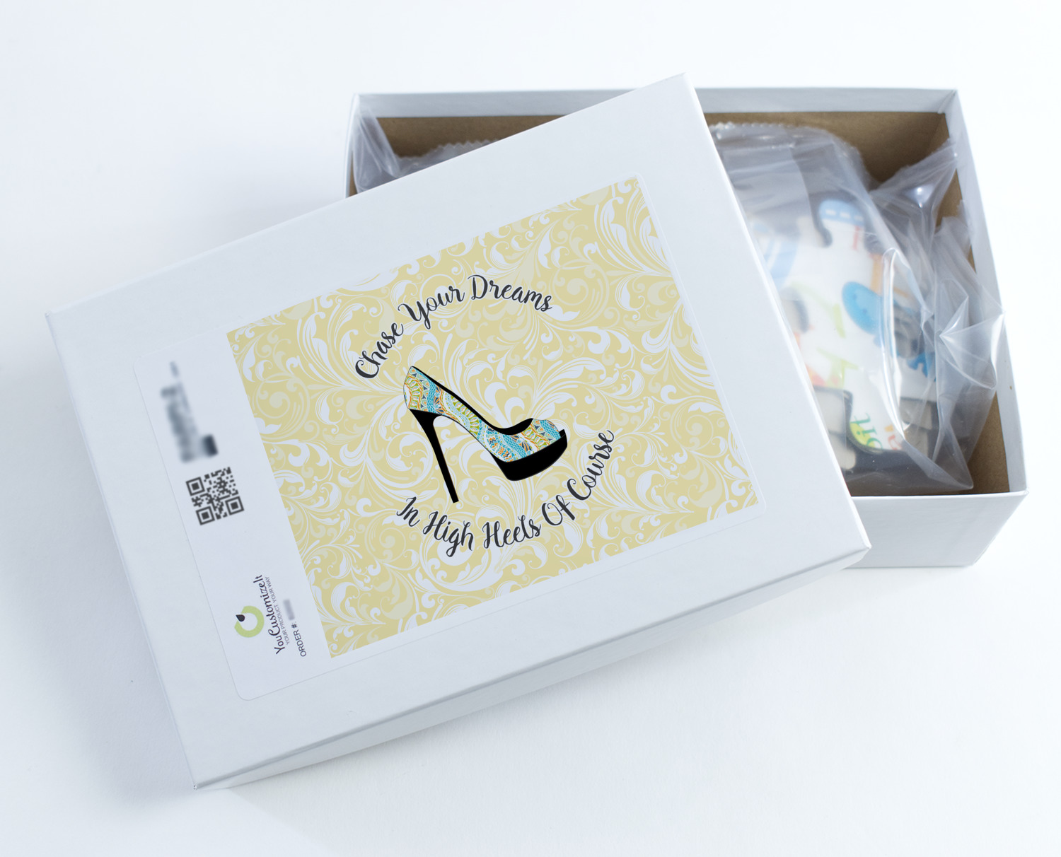 This High Heels Design with "Chase Your Dreams in High Heels Of Course" is simply beautiful. The design has a soft yellow leafy swirls background. The foreground is a beautiful stiletto high heel shoe filled with our abstract snakes pattern. We used our "graphic with arched text" style and have the words "Chase Your Dream" on top and "In High Heels of Course" on the bottom.