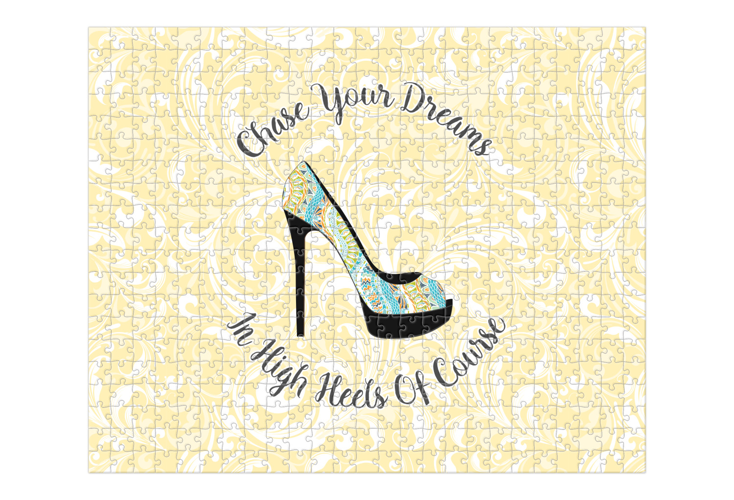 This High Heels Design with "Chase Your Dreams in High Heels Of Course" is simply beautiful. The design has a soft yellow leafy swirls background. The foreground is a beautiful stiletto high heel shoe filled with our abstract snakes pattern. We used our "graphic with arched text" style and have the words "Chase Your Dream" on top and "In High Heels of Course" on the bottom.