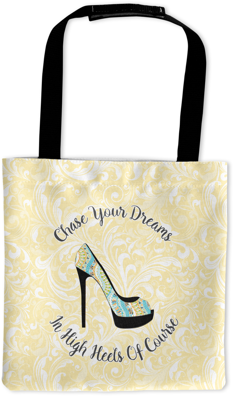 This High Heels Design with "Chase Your Dreams in High Heels Of Course" is simply beautiful. The design has a soft yellow leafy swirls background. The foreground is a beautiful stiletto high heel shoe filled with our abstract snakes pattern. We used our "graphic with arched text" style and have the words "Chase Your Dream" on top and "In High Heels of Course" on the bottom.