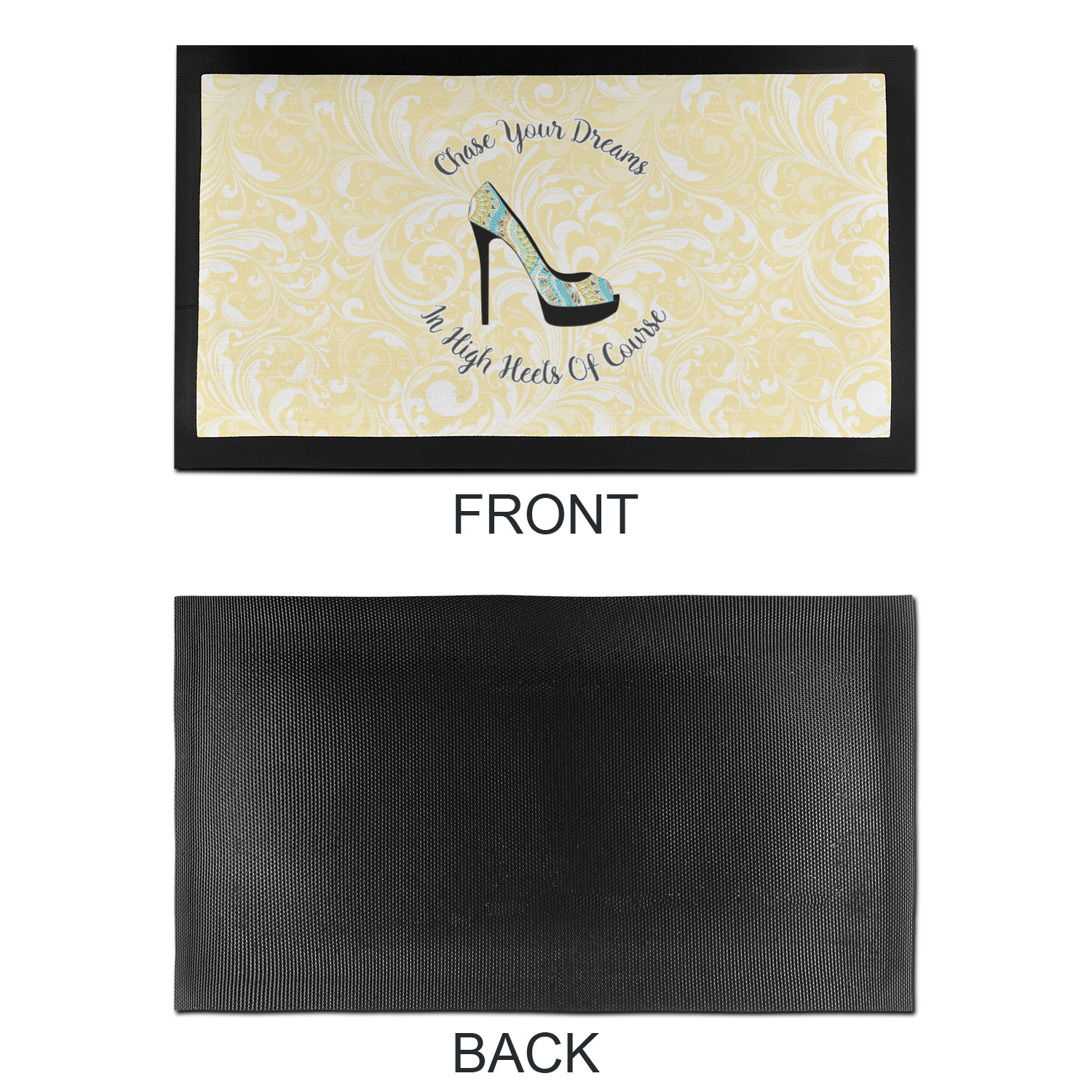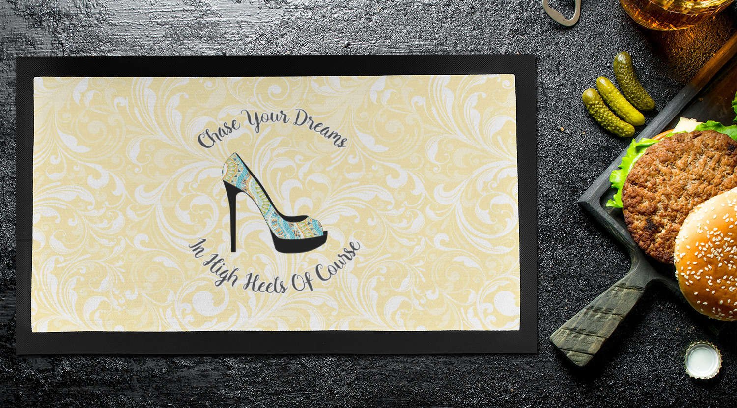 This High Heels Design with "Chase Your Dreams in High Heels Of Course" is simply beautiful. The design has a soft yellow leafy swirls background. The foreground is a beautiful stiletto high heel shoe filled with our abstract snakes pattern. We used our "graphic with arched text" style and have the words "Chase Your Dream" on top and "In High Heels of Course" on the bottom.