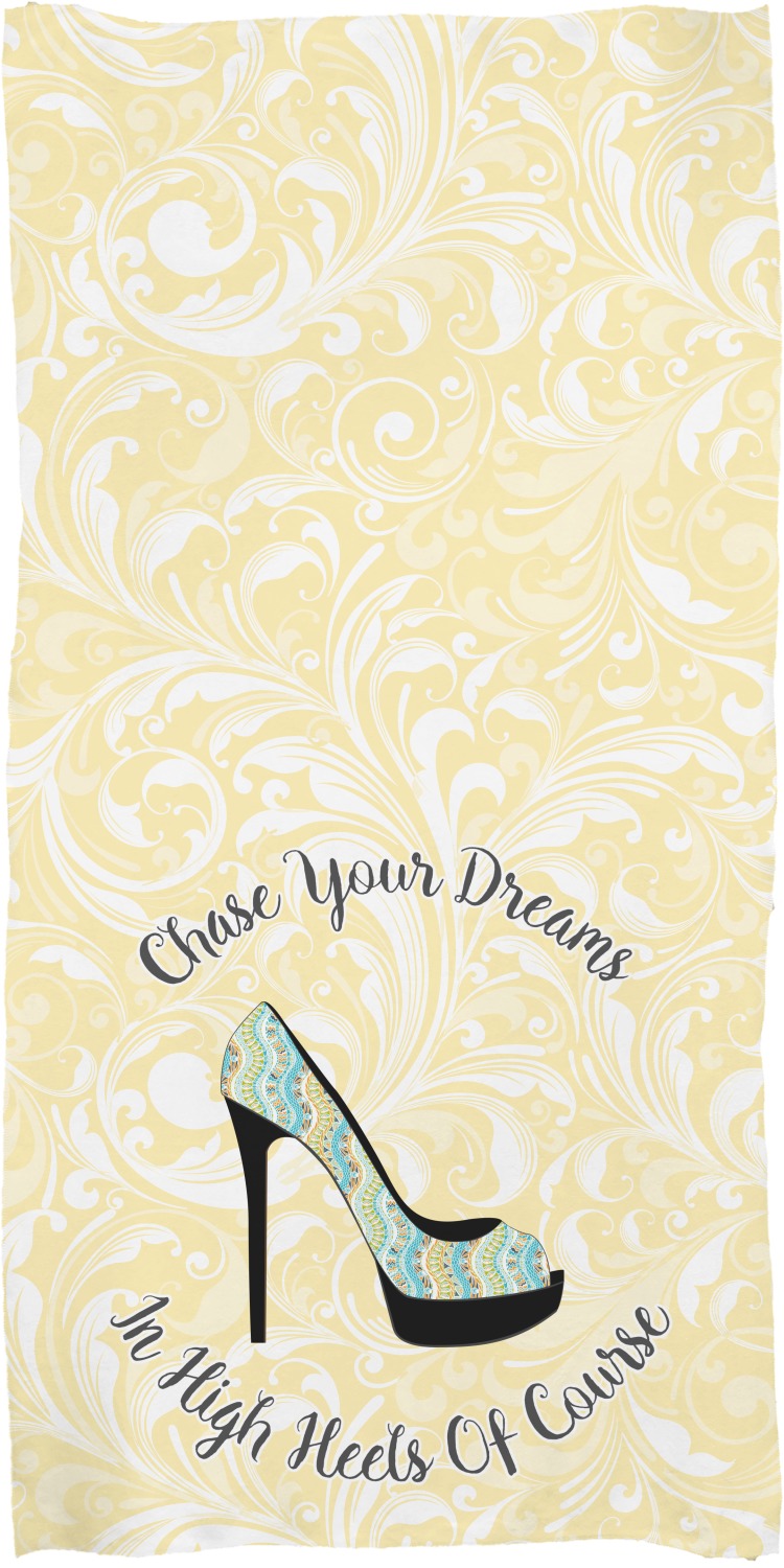 This High Heels Design with "Chase Your Dreams in High Heels Of Course" is simply beautiful. The design has a soft yellow leafy swirls background. The foreground is a beautiful stiletto high heel shoe filled with our abstract snakes pattern. We used our "graphic with arched text" style and have the words "Chase Your Dream" on top and "In High Heels of Course" on the bottom.