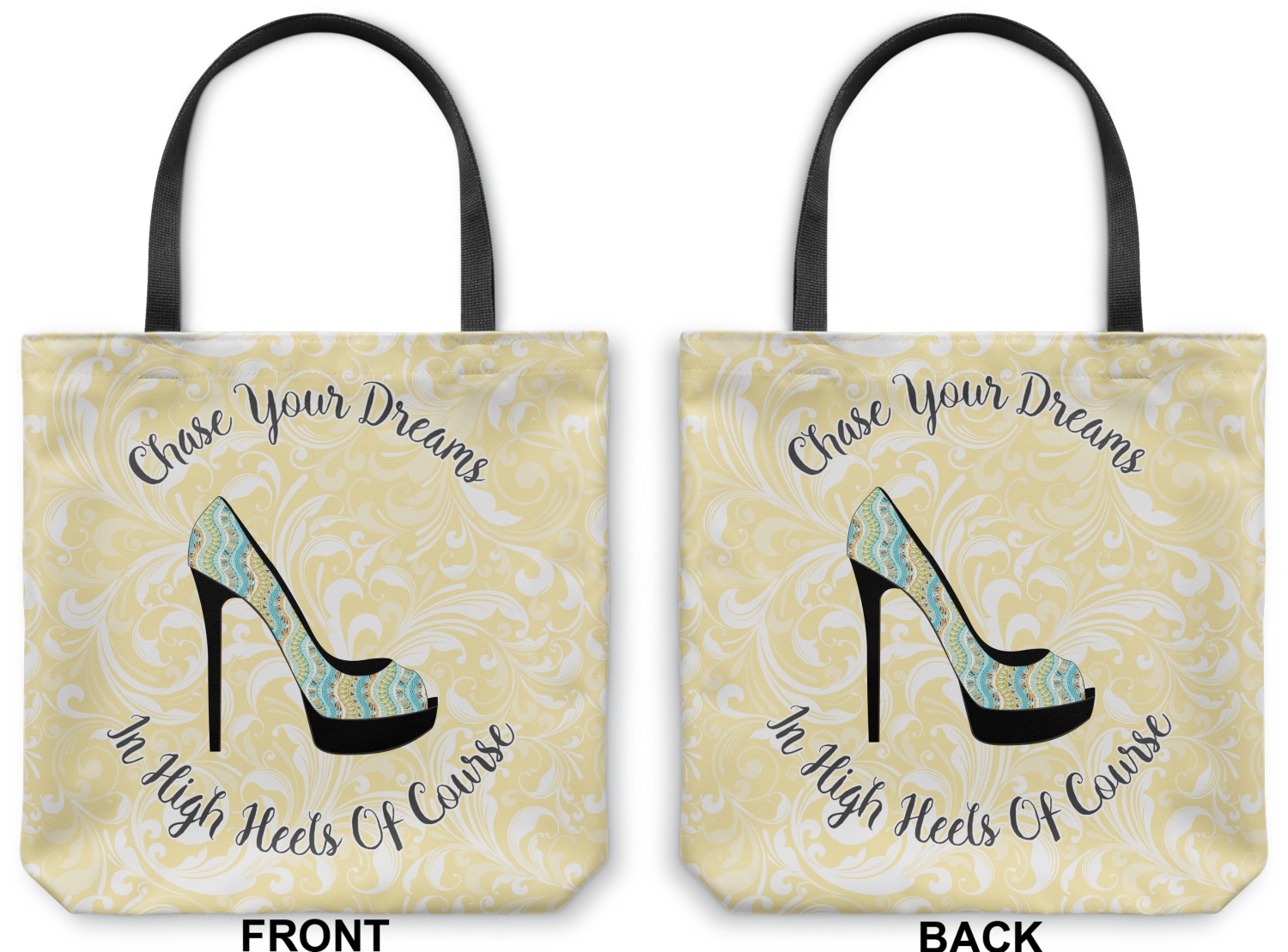 This High Heels Design with "Chase Your Dreams in High Heels Of Course" is simply beautiful. The design has a soft yellow leafy swirls background. The foreground is a beautiful stiletto high heel shoe filled with our abstract snakes pattern. We used our "graphic with arched text" style and have the words "Chase Your Dream" on top and "In High Heels of Course" on the bottom.