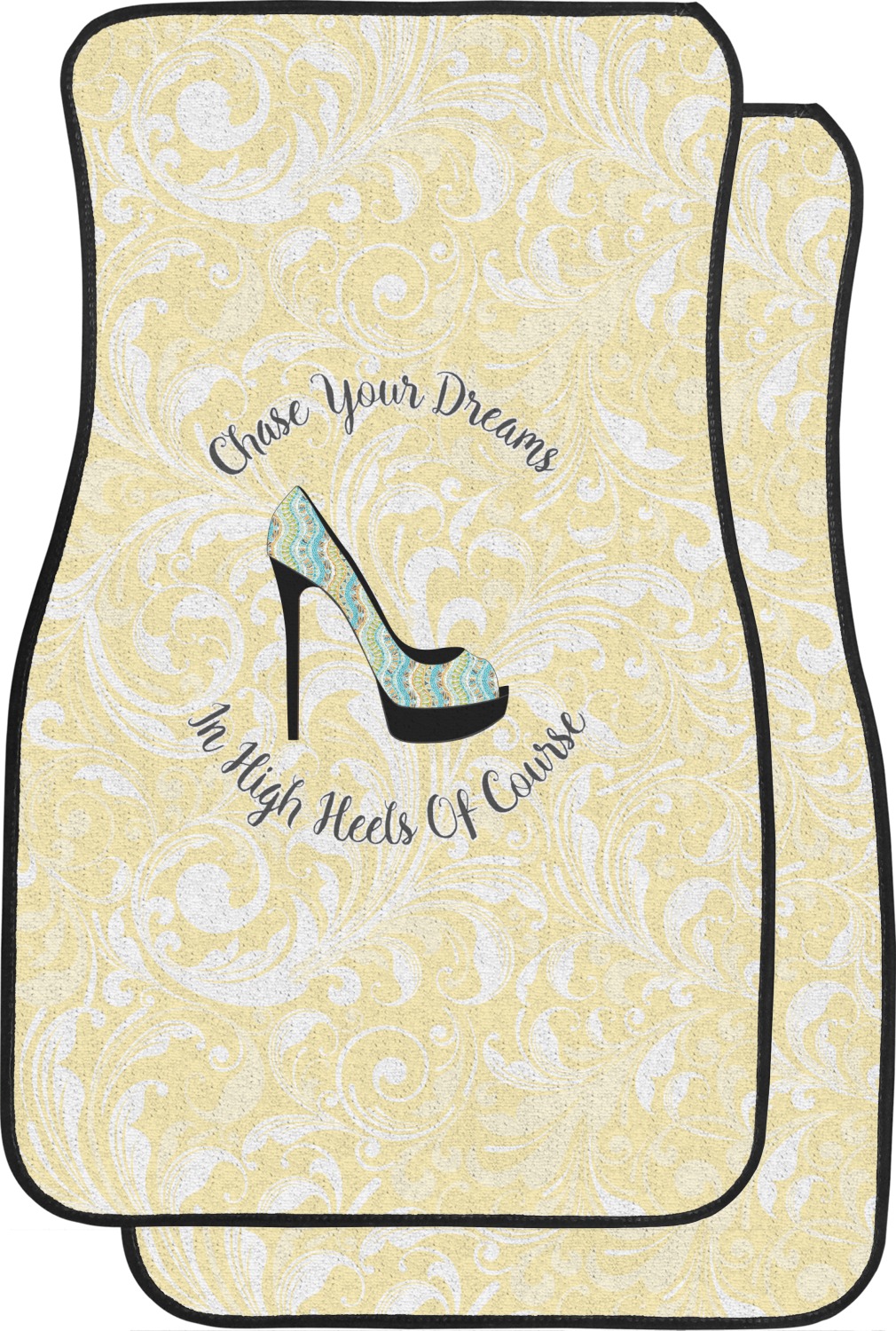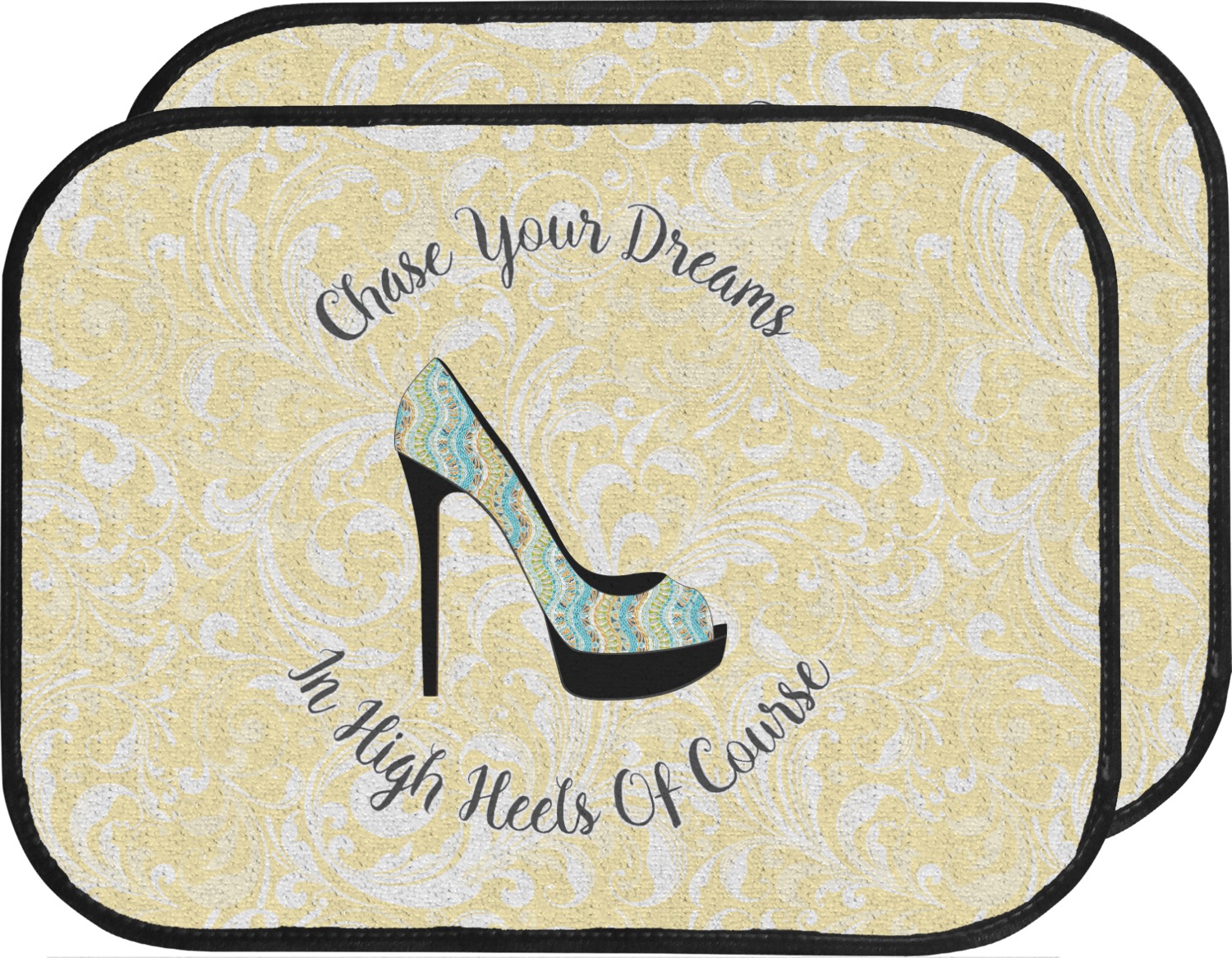 This High Heels Design with "Chase Your Dreams in High Heels Of Course" is simply beautiful. The design has a soft yellow leafy swirls background. The foreground is a beautiful stiletto high heel shoe filled with our abstract snakes pattern. We used our "graphic with arched text" style and have the words "Chase Your Dream" on top and "In High Heels of Course" on the bottom.