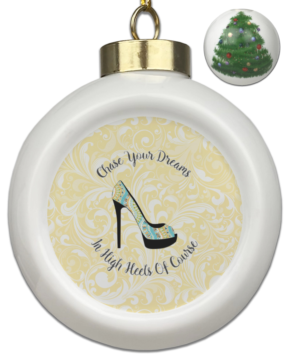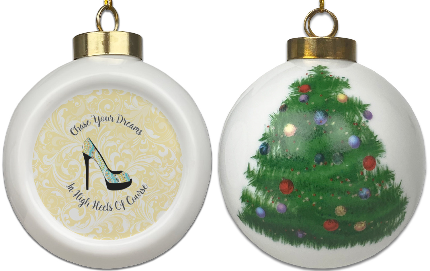 Our Christmas ornaments are a unique ceramic ball shape with a twist as it has a flat face to display your custom design! Select from one of our two design types - Christmas Tree or Poinsettia Garland - to adorn the curved back of your personal design. Each ornament measures 3H x 2.5W x 2D accompanied with a gold string accent for finishing touches to hang on your beautiful Christmas tree!