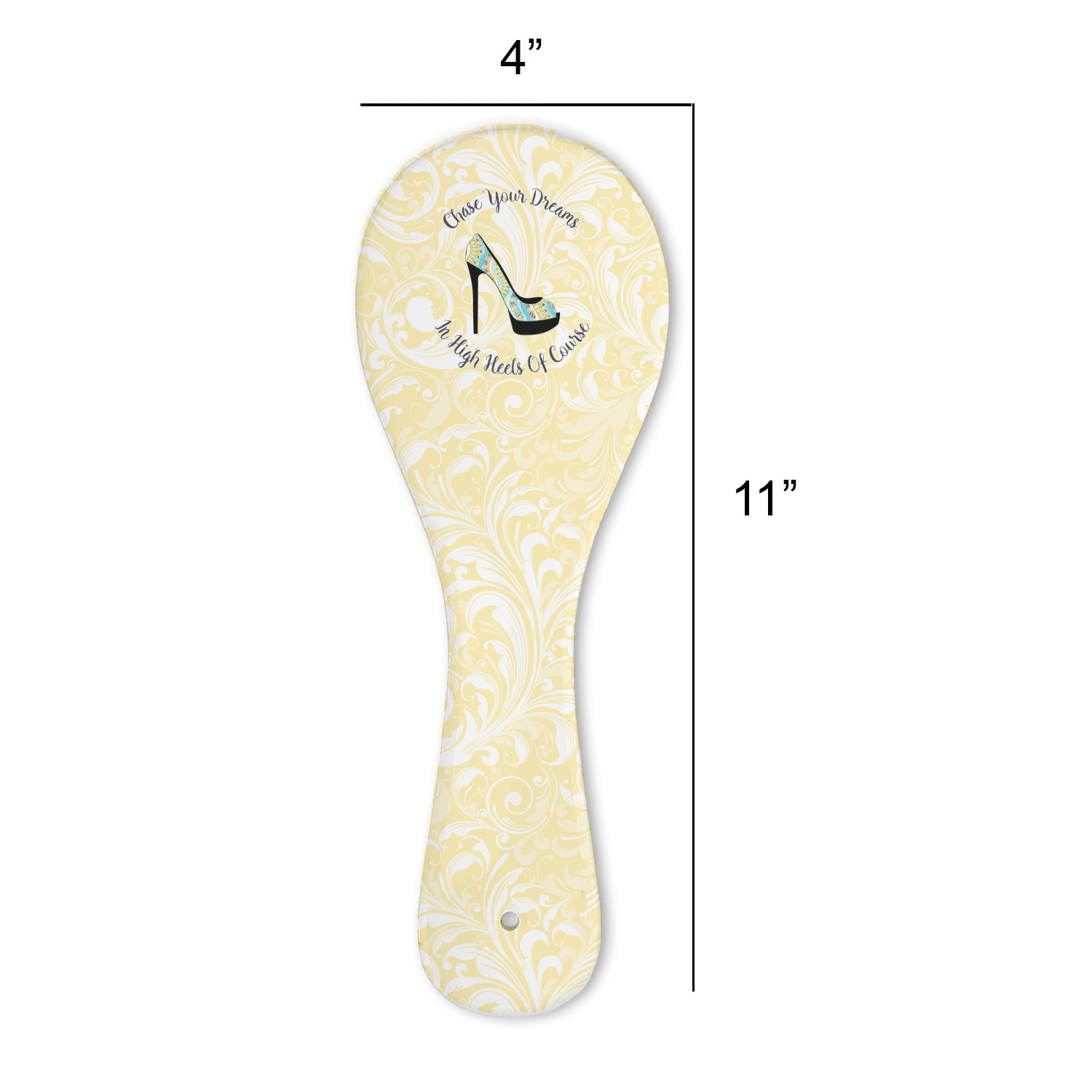 This High Heels Design with "Chase Your Dreams in High Heels Of Course" is simply beautiful. The design has a soft yellow leafy swirls background. The foreground is a beautiful stiletto high heel shoe filled with our abstract snakes pattern. We used our "graphic with arched text" style and have the words "Chase Your Dream" on top and "In High Heels of Course" on the bottom.