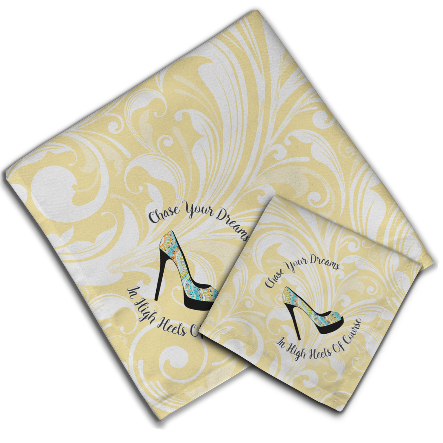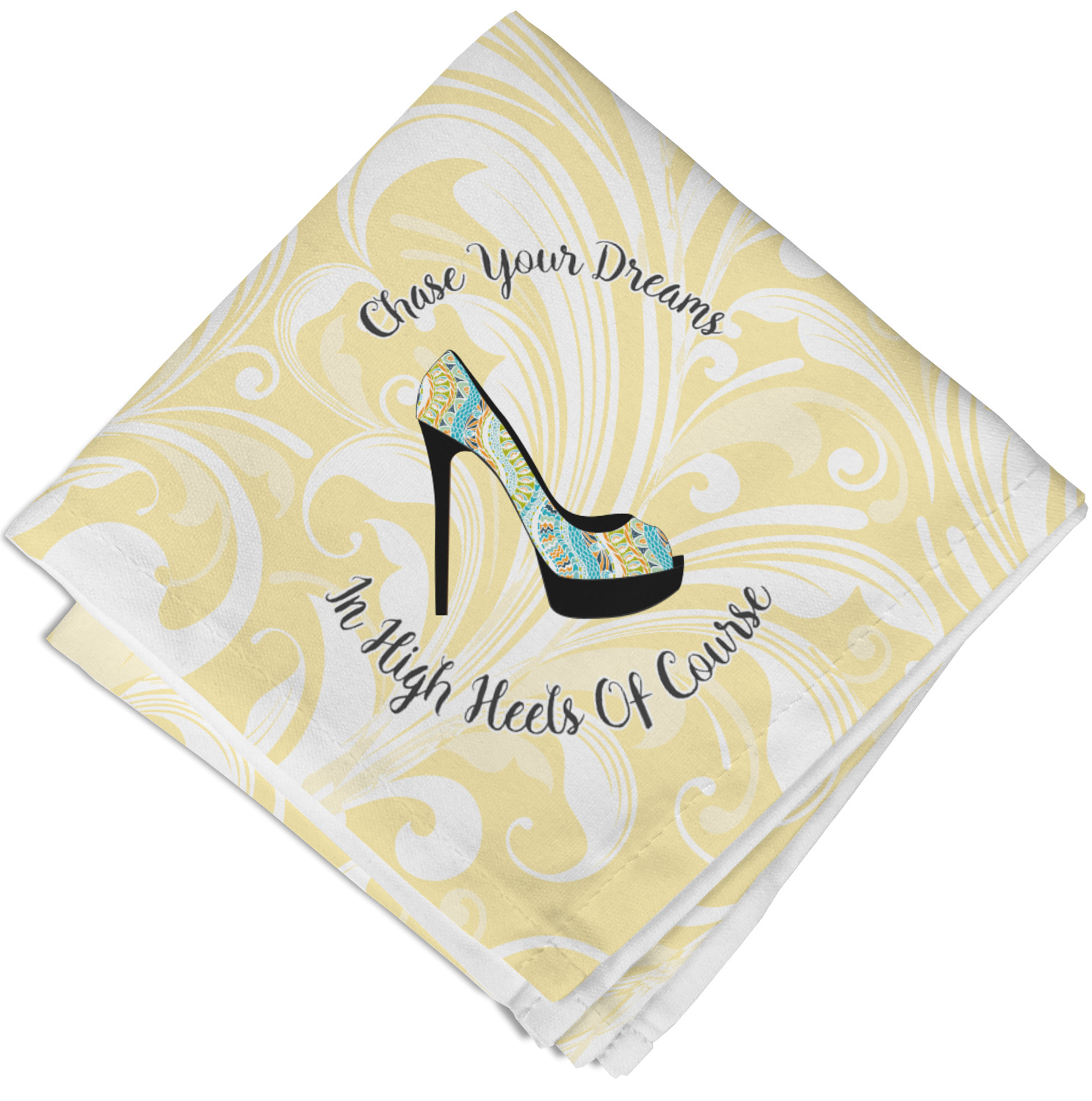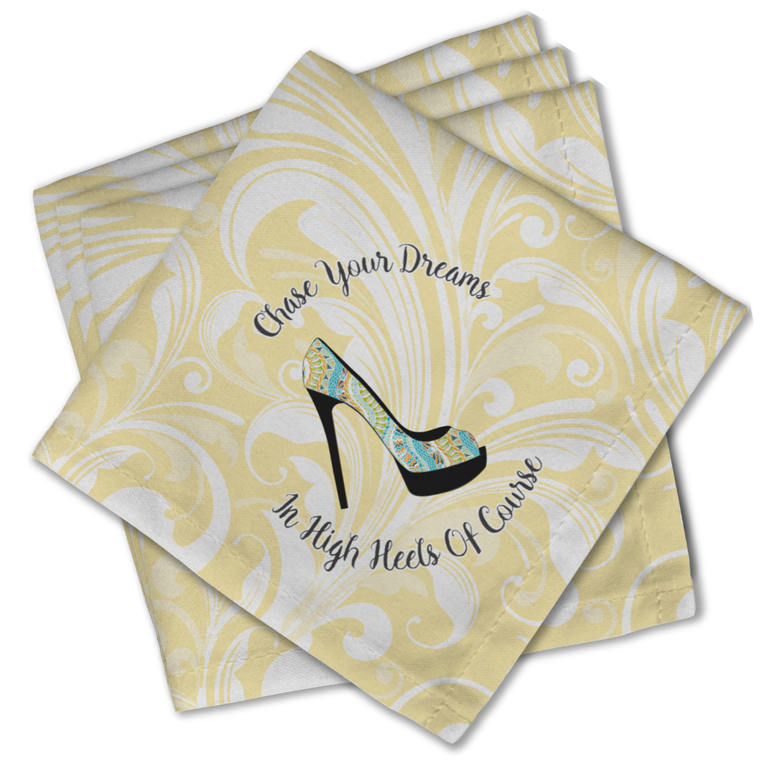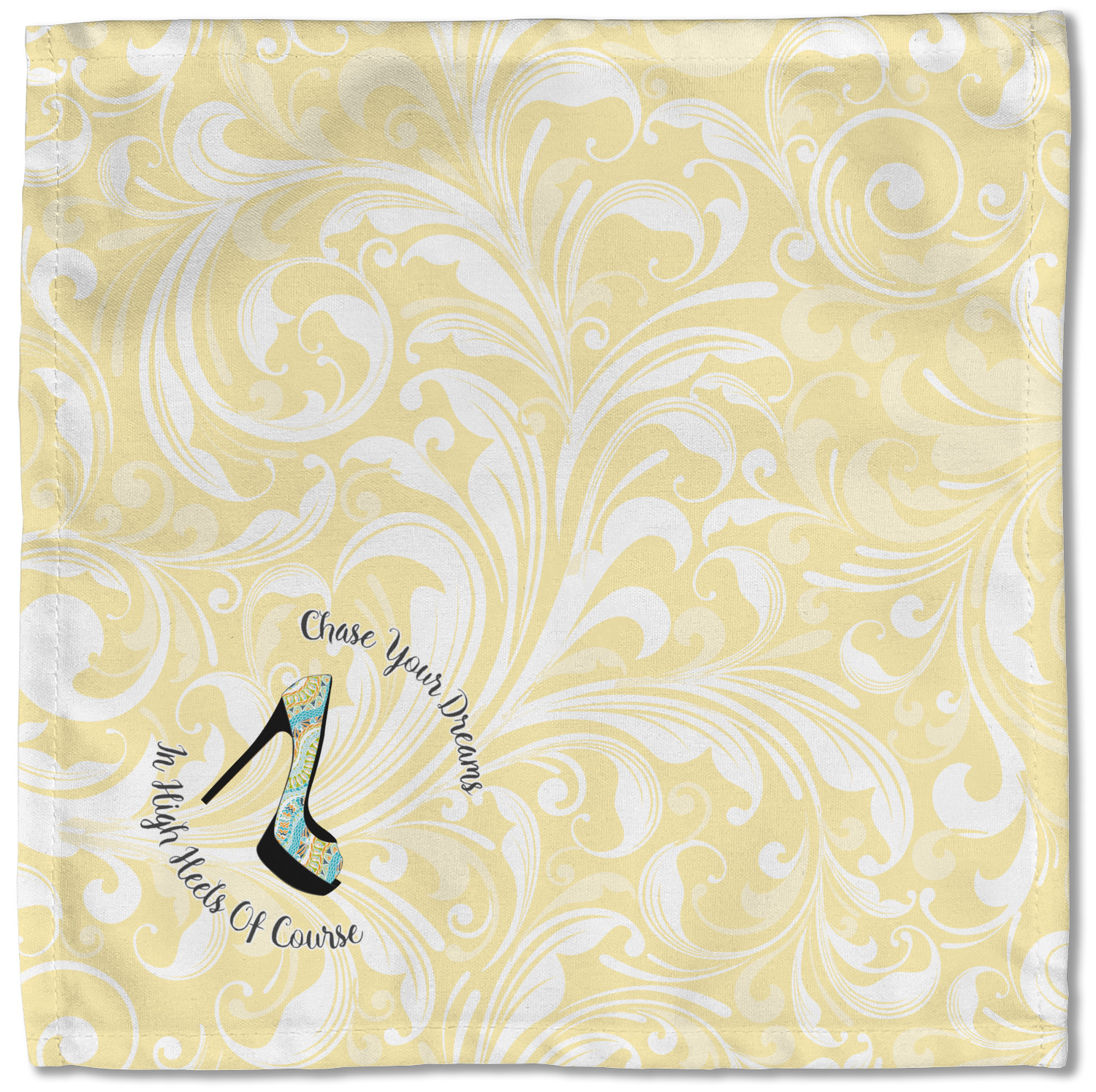 This High Heels Design with "Chase Your Dreams in High Heels Of Course" is simply beautiful. The design has a soft yellow leafy swirls background. The foreground is a beautiful stiletto high heel shoe filled with our abstract snakes pattern. We used our "graphic with arched text" style and have the words "Chase Your Dream" on top and "In High Heels of Course" on the bottom.