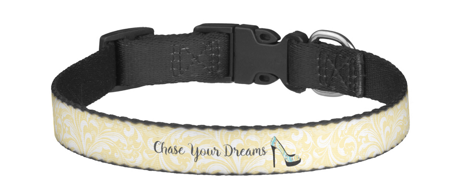 This sturdy collar, made from a durable nylon weave, will outlive your dog's episodes of excited tugging and pulling. Courtesy of its thick plastic buckle and adjuster, this collar is adjustable and accommodating of any dog. Structurally, the collar is a single piece of nylon weave that is sewn together, and features a solid metal loop where you can attach a leash or dog tag. We print and display your dog's name and pattern across the middle of the personalized dog collar.
